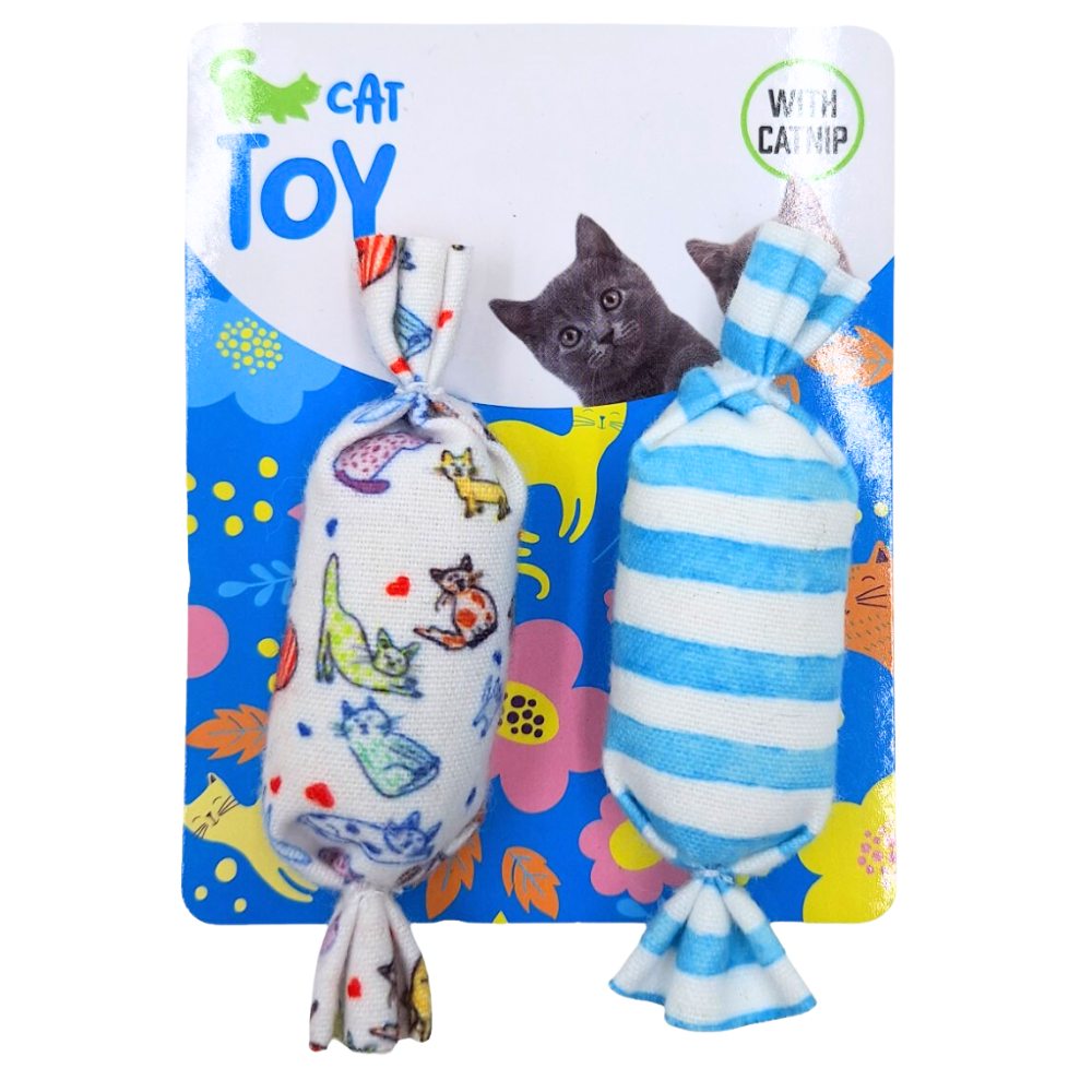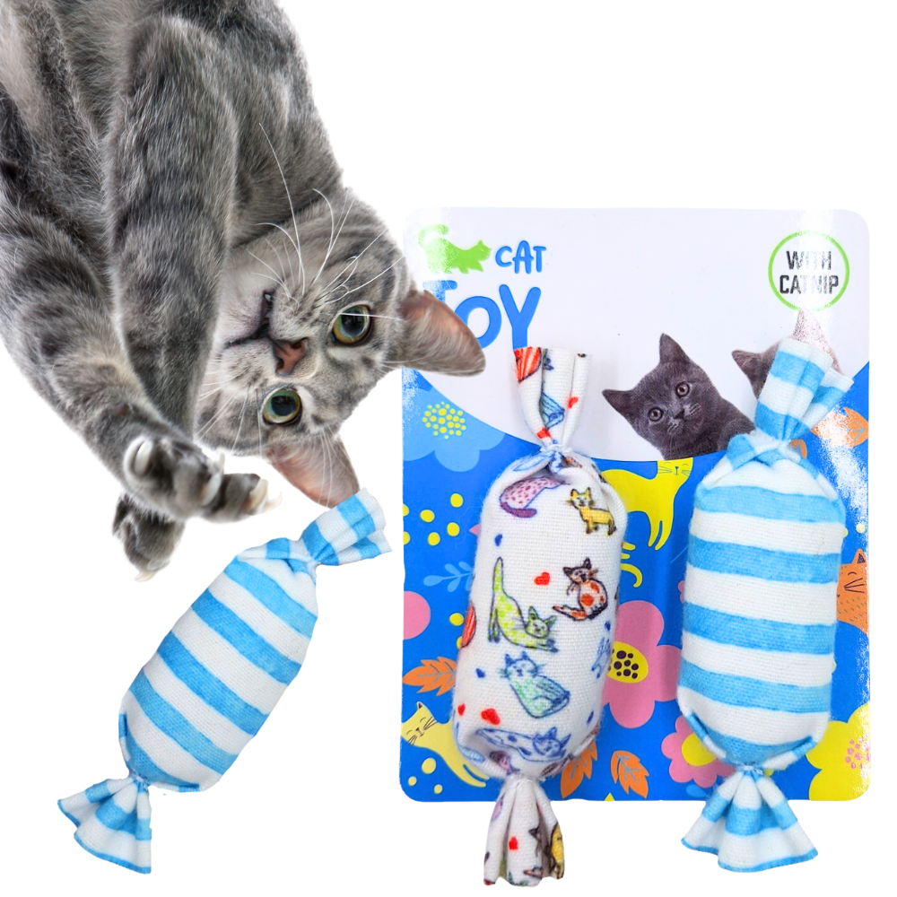 CAT TOY ZABAWKA DLA KOTA Z KOCIMIĘTKĄ 2 SZT. CUKIERKI BIAŁY W KOTY I BIAŁY W NIEBIESKIE PASKI