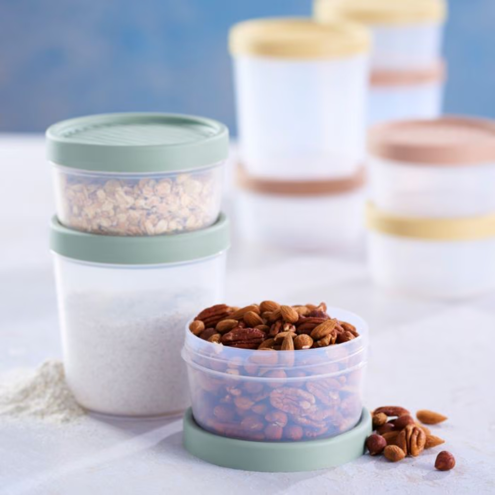 - Kompaktowy i lekki design – pojemniki można wygodnie ustawiać jeden w drugim, oszczędzając miejsce w szafce.