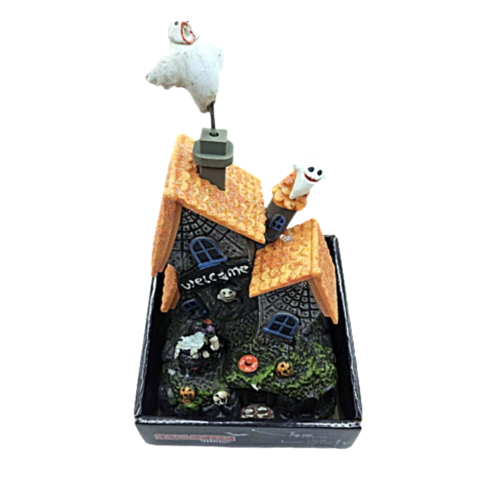 Klimatyczna dekoracja na Halloween, straszny domek wraz z efektami dźwiękowymi. Najbardziej atrakcyjna dekoracja tego święta i obowiązkowy element nocy strachów. Wspaniale będzie prezentował się podświetlony lampkami LED (które są zamontowane w domku), dzięki temu będzie przykuwać uwagę gości. Domek może cieszyć naturalnym pięknem lub rodzinnie możecie go udekorować dowolnie wybraną metodą. Kolorowy i jedyny w swoim rodzaju stanie się piękną i niepowtarzalną ozdobą. Ten upiorny domek sprawdzi się z każdą dekoracją. Nastrój wieczorem gwarantowany!