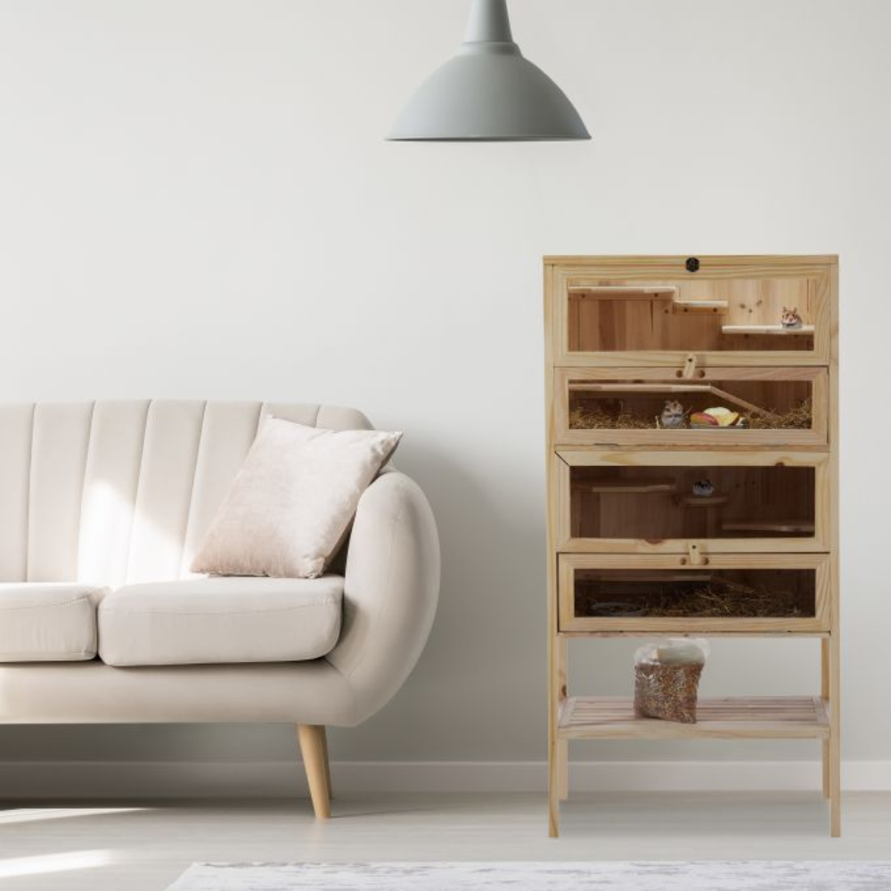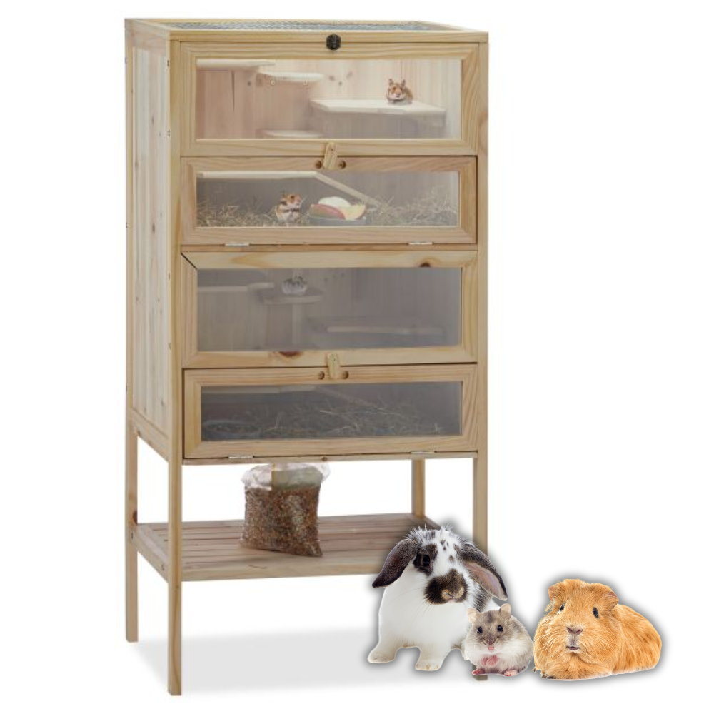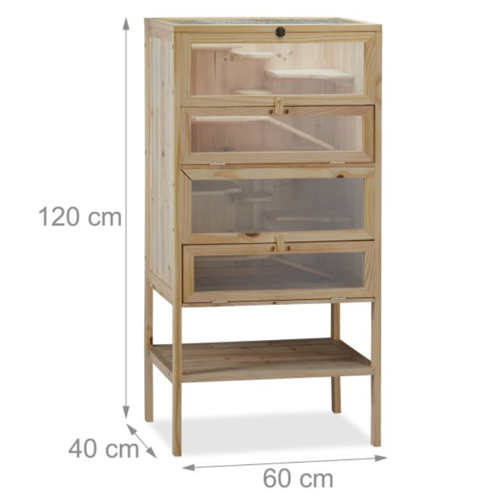 Nasza drewniana klatka dla gryzoni w rozmiarze XXL to idealne rozwiązanie na przechowywanie chomika syryjskiego, myszek i innych małych zwierzaków. Piętrowy domek wyposażony jest w schodki i podesty, które z pewnością przysporzą dużo zabawy wszystkim ciekawskim gryzoniom.