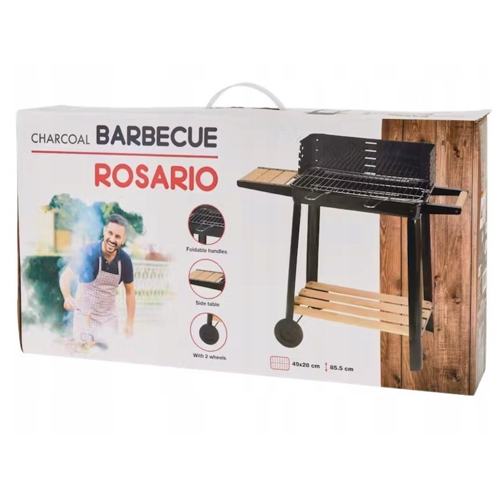 GRILL WĘGLOWY ROSARIO 49 X 28 CM Z KÓŁKAMI RĄCZKĄ PÓŁKĄ BOCZNĄ OGRODOWY