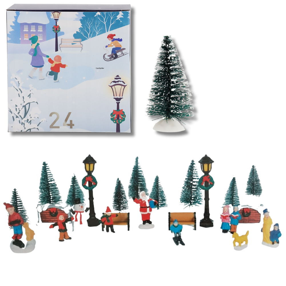 ✅ Kalendarz adwentowy zawierający 24 figurki z tworzywa sztucznego tworzące zestaw świątecznej wioski.