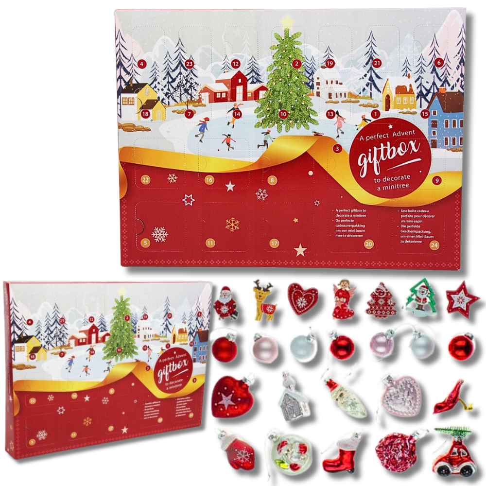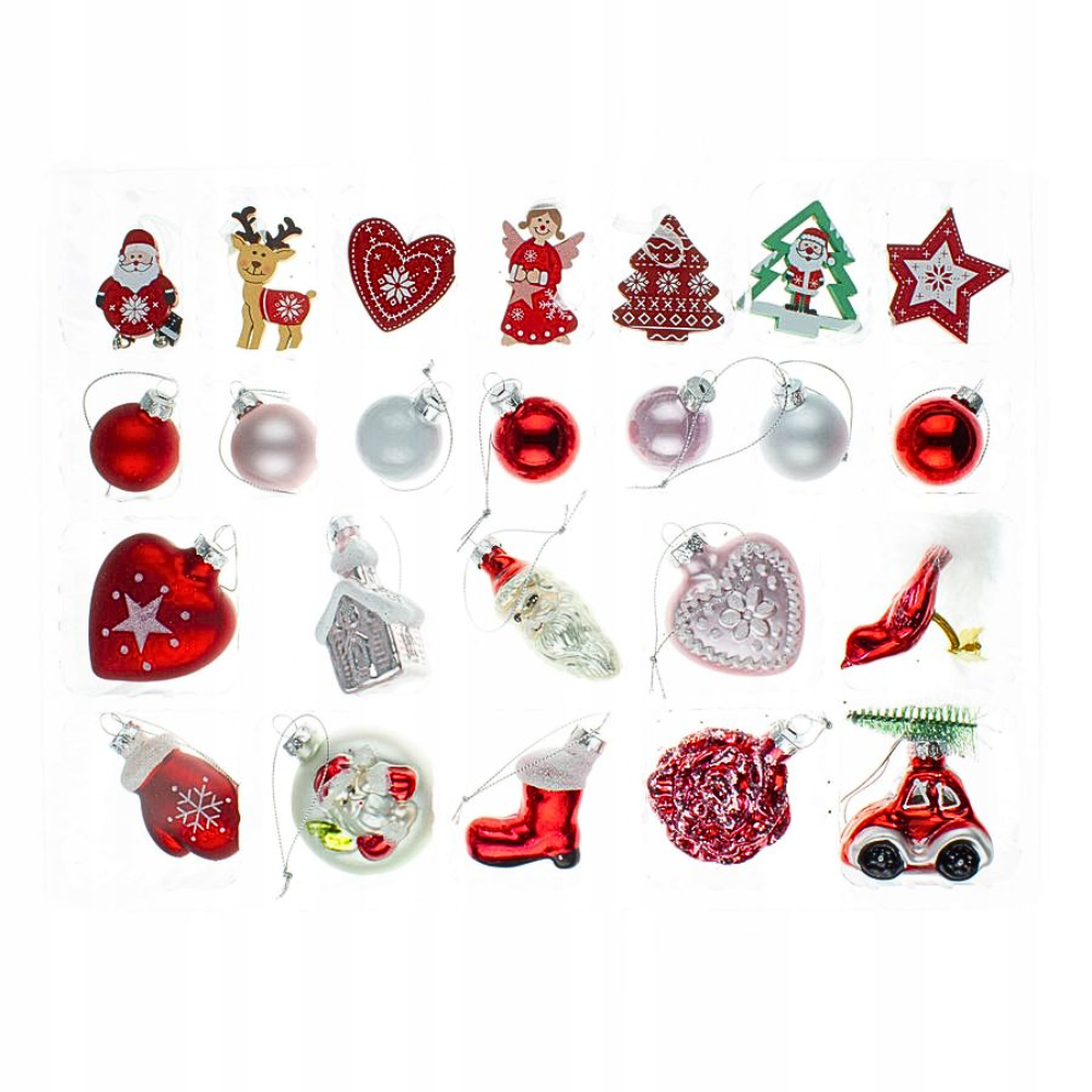 ✅ Kalendarz adwentowy z ozdobami na choinkę z dominującym kolorem czerwonym.