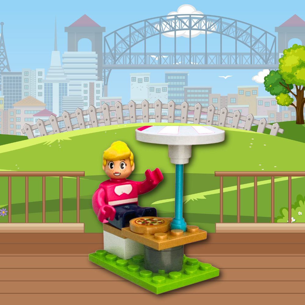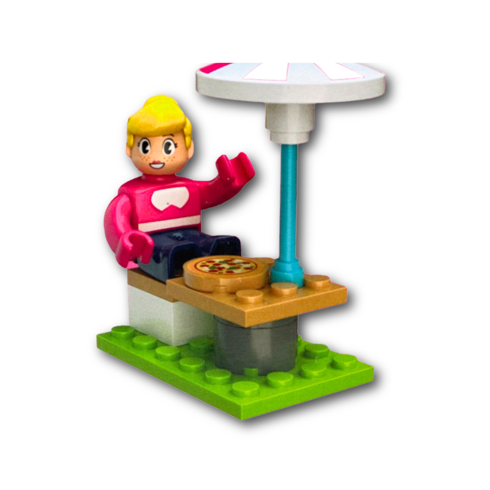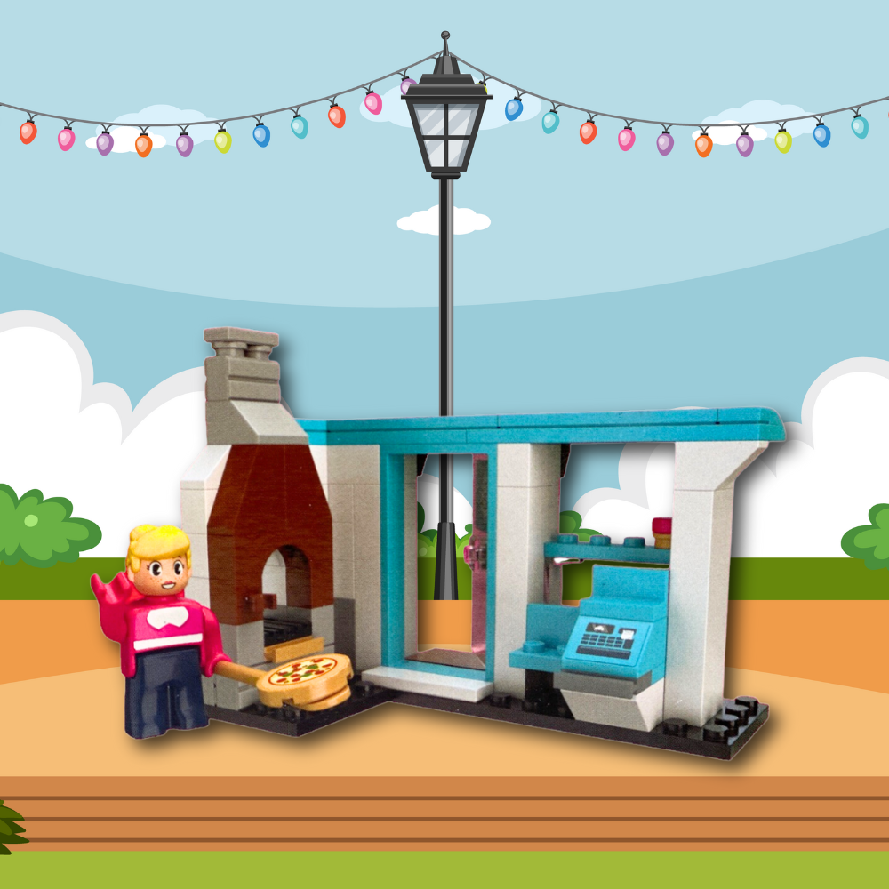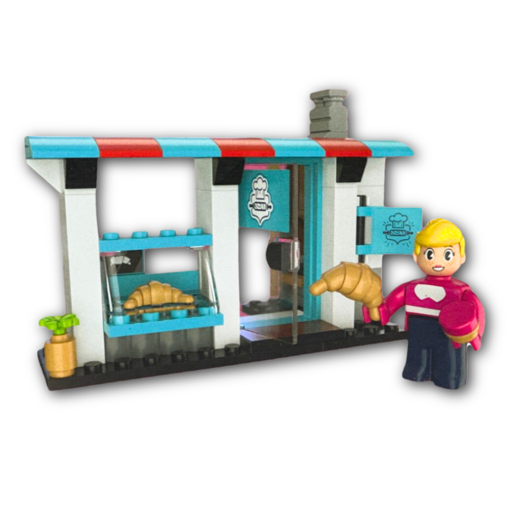 Dzięki 99 klockom zbudujesz piekarnię wraz z witryną i piecem do wypiekania pizzy oraz stolikiem dla gości.