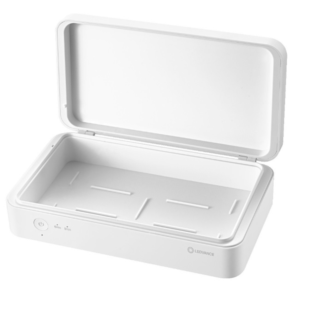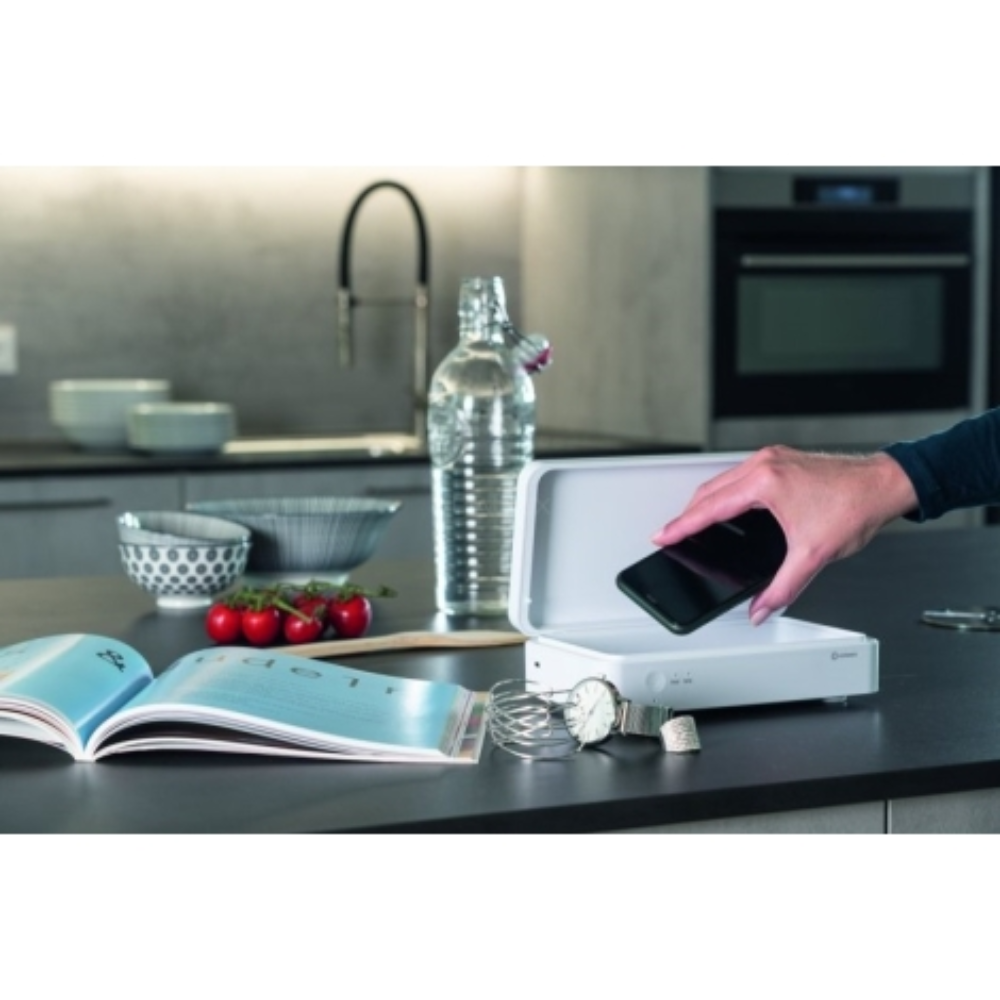 W dolnej części pudełka znajdują się podpórki, dzięki czemu płaskie przedmioty, takie jak np. telefony komórkowe, są dezynfekowane bez konieczności odwracania