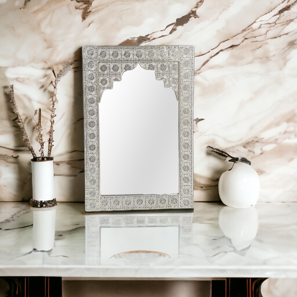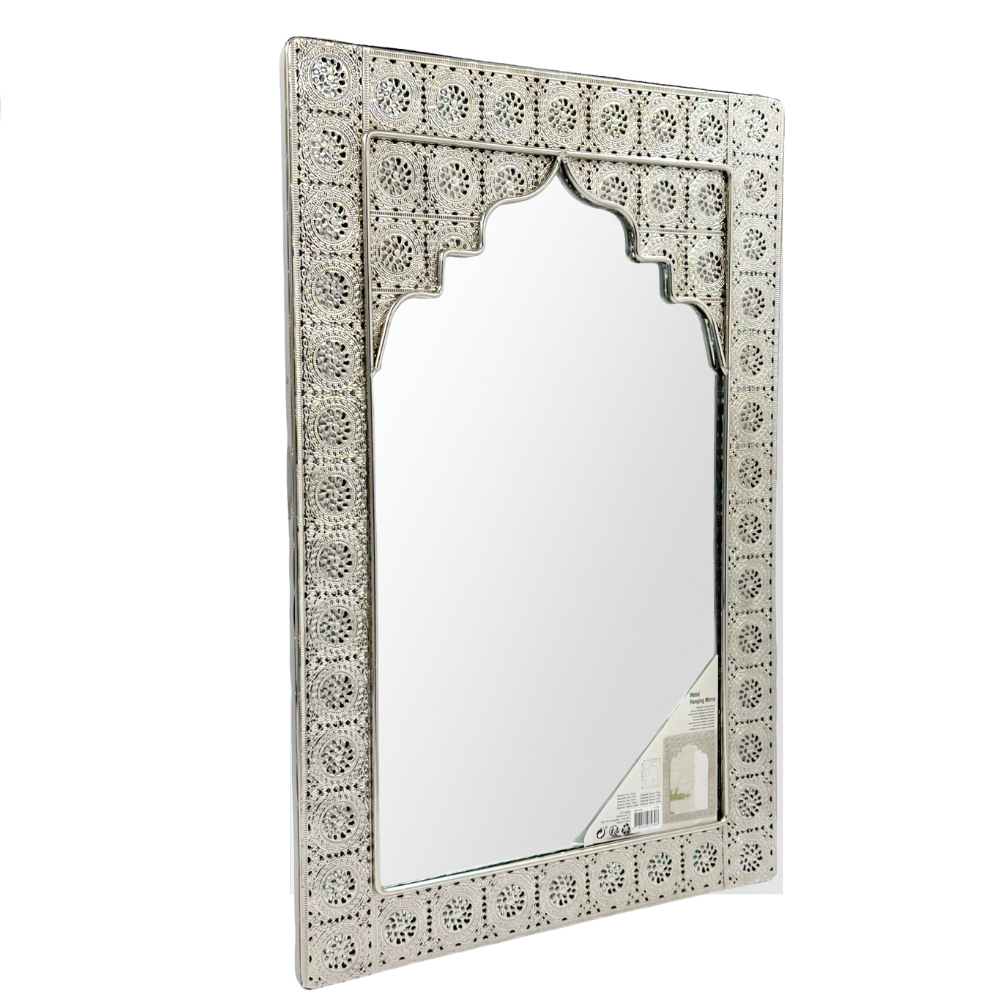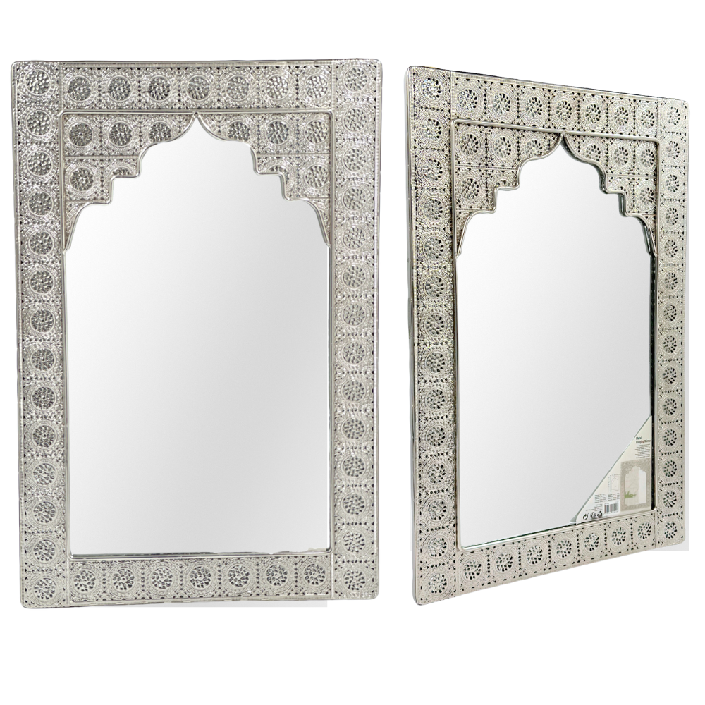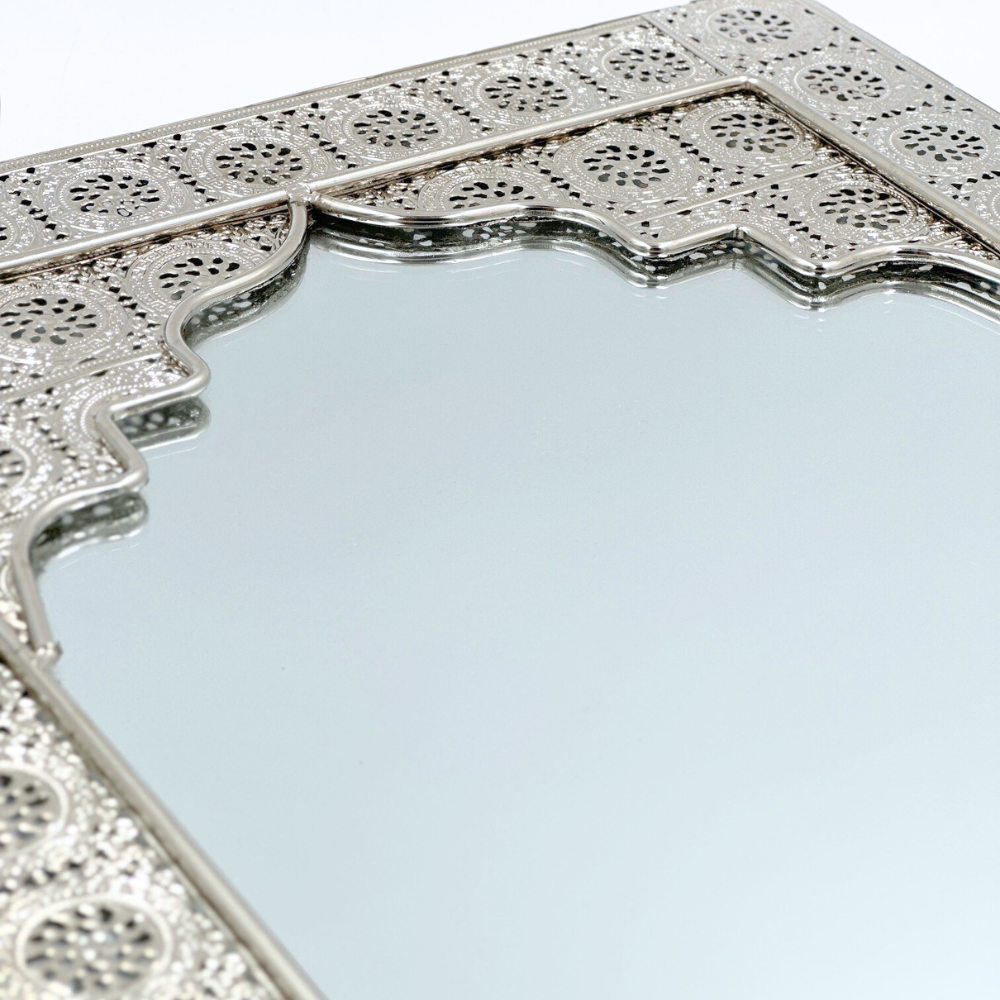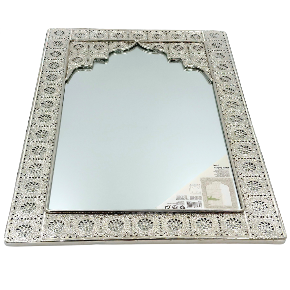 Orientalne srebrne lustro wykonane z metalu bardzo płaskiego na ścianę. Ten kształt jest zabawny, a pośrodku znajduje się lustro, w które można patrzeć z przyjemnością każdego dnia.
