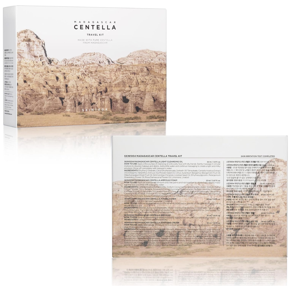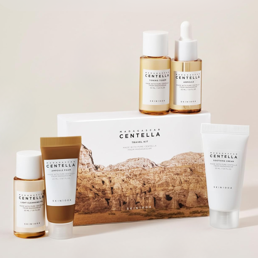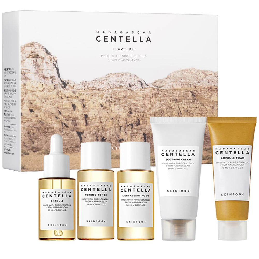 Madagascar Centella Travel Kit to praktyczny zestaw pięciu bestsellerowych produktów pielęgnacyjnych z linii Centella od SKIN1004, zamknięty w kompaktowych opakowaniach idealnych do zabrania w podróż.