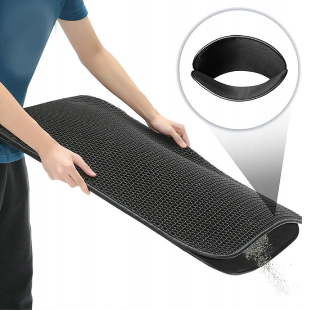 - Łatwe czyszczenie – Matę można szybko opróżnić, wysypując żwirek z powrotem do kuwety, a także łatwo ją umyć wodą.