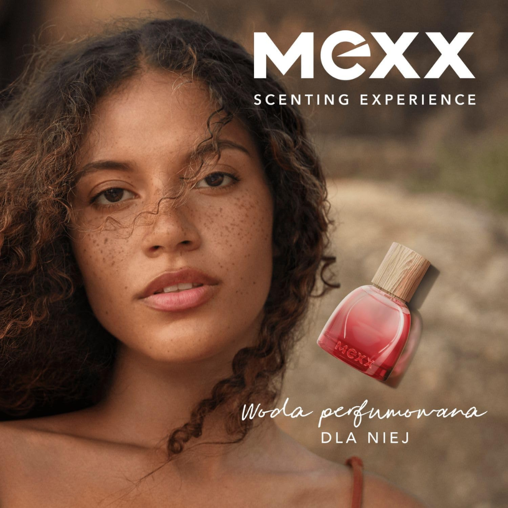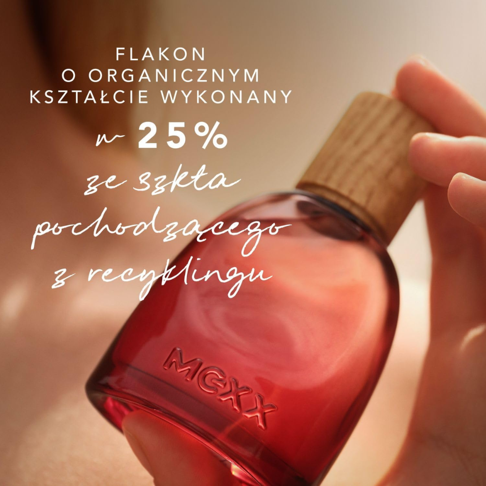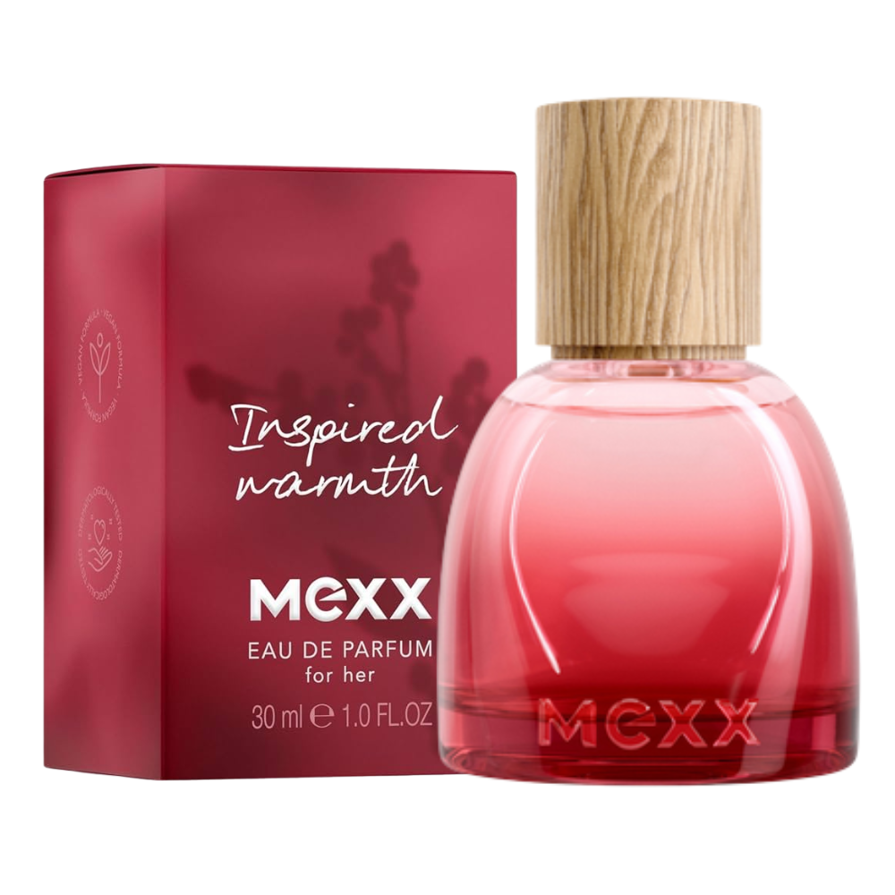 MEXX Scenting Experience to nowy rytuał zapachowy dla umysłu, ciała i wnętrz. Skomponowana tak, by pobudzić Twoje zmysły kolekcja Inspired Warmth wywołuje uczucie otulającego ciepła. Weź głęboki oddech, doświadczaj chwili i pozwól, by owocowo-ambrowa kompozycja Inspired Warmth oczarowała Cię eleganckimi, ciepłymi nutami. Ten długotrwały, poprawiający nastrój zapach dla Niej przypomina ciepło objęć ukochanej osoby – kompozycja to urokliwe połączenie soczystych akordów czerwonych owoców, kojących aromatów wanilii i bitej śmietany, a także delikatnych ambrowych woni. Tę damską wodę perfumowaną zamknięto w przyjemnym do trzymania flakonie o organicznym kształcie, który nawiązuje do niedoskonałości natury. Kojący zapach ma wegańską, przetestowaną dermatologicznie formułę, flakon zaś został wyprodukowany w 25% ze szkła pochodzącego z recyklingu.