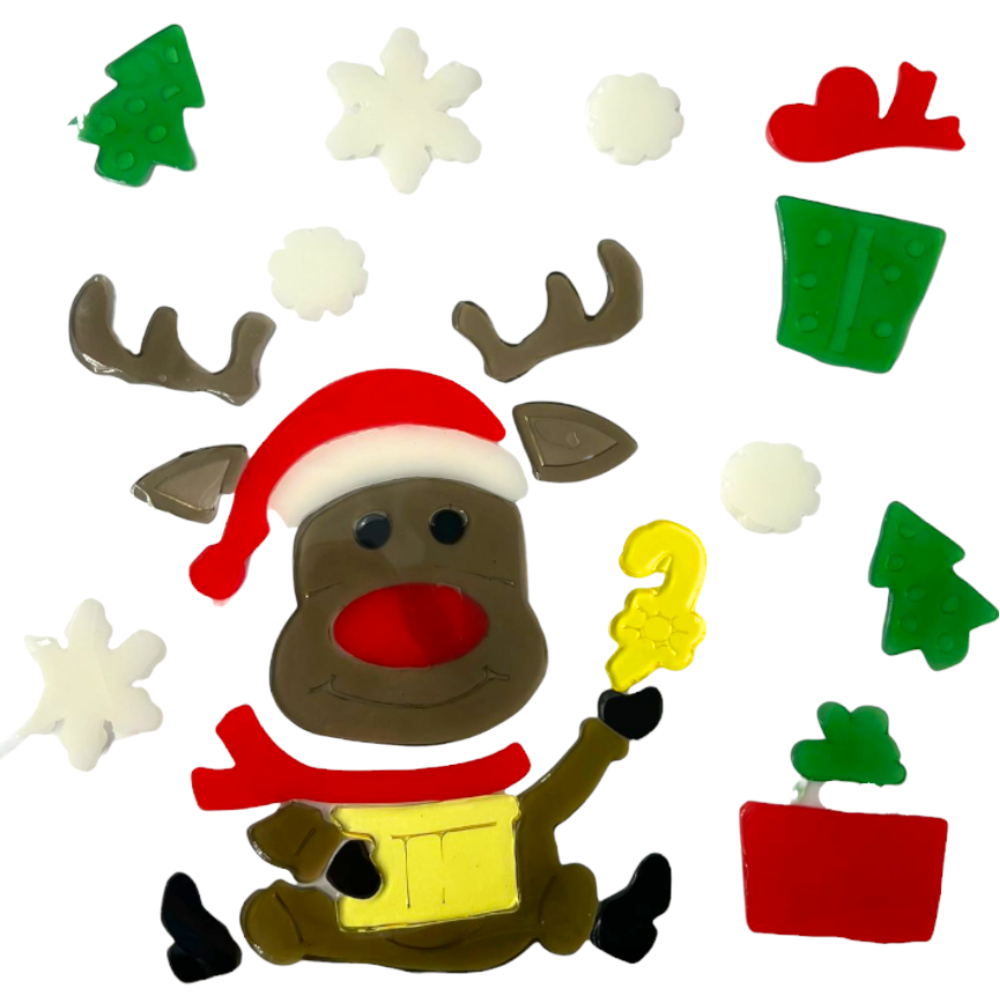 NAKLEJKI NA OKNO ŻELOWE RENIFER Z CZAPKĄ PREZENTY ŚWIĘTA ŚNIEŻYNKI