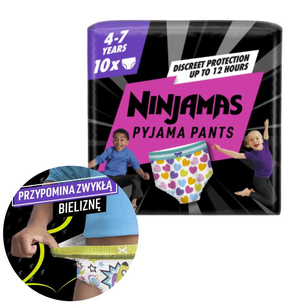 Ninjamas to chłonna bielizna nocna zaprojektowana by pomóc dzieciom radzić sobie z wypadkami związanymi z nocnym moczeniem. Dzięki ochronie przed wyciekiem przez całą noc zapewniają dziecku pewność siebie. Technologia natychmiastowego wchłaniania Ninjamas bezpośrednio pochłania wilgoć i zapewnia niezawodną ochronę. Mankiet 360° FormFit dopasowuje się do brzucha i jest tak dyskretny i wygodny jak bielizna. Materiał QuietCloth minimalizuje szeleszczenie, by zapewnić dyskrecję. Ninjamas są odpowiednie dla skóry wrażliwej.