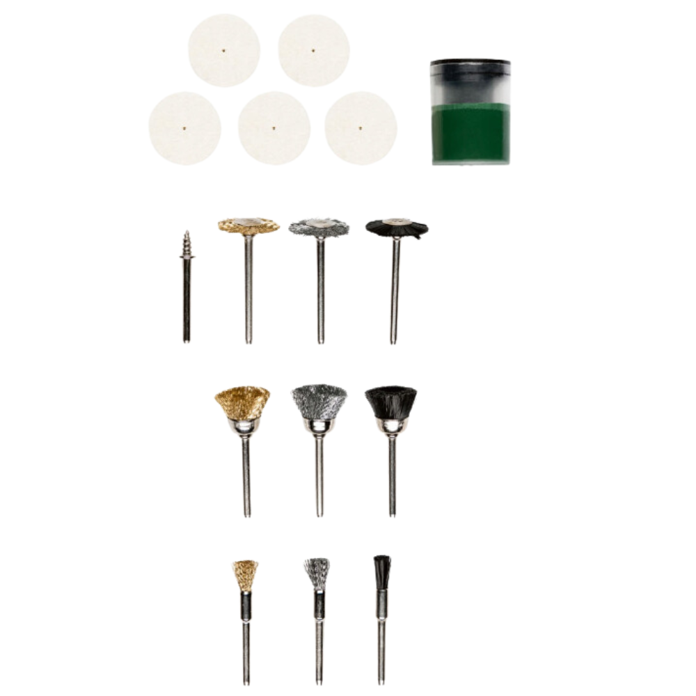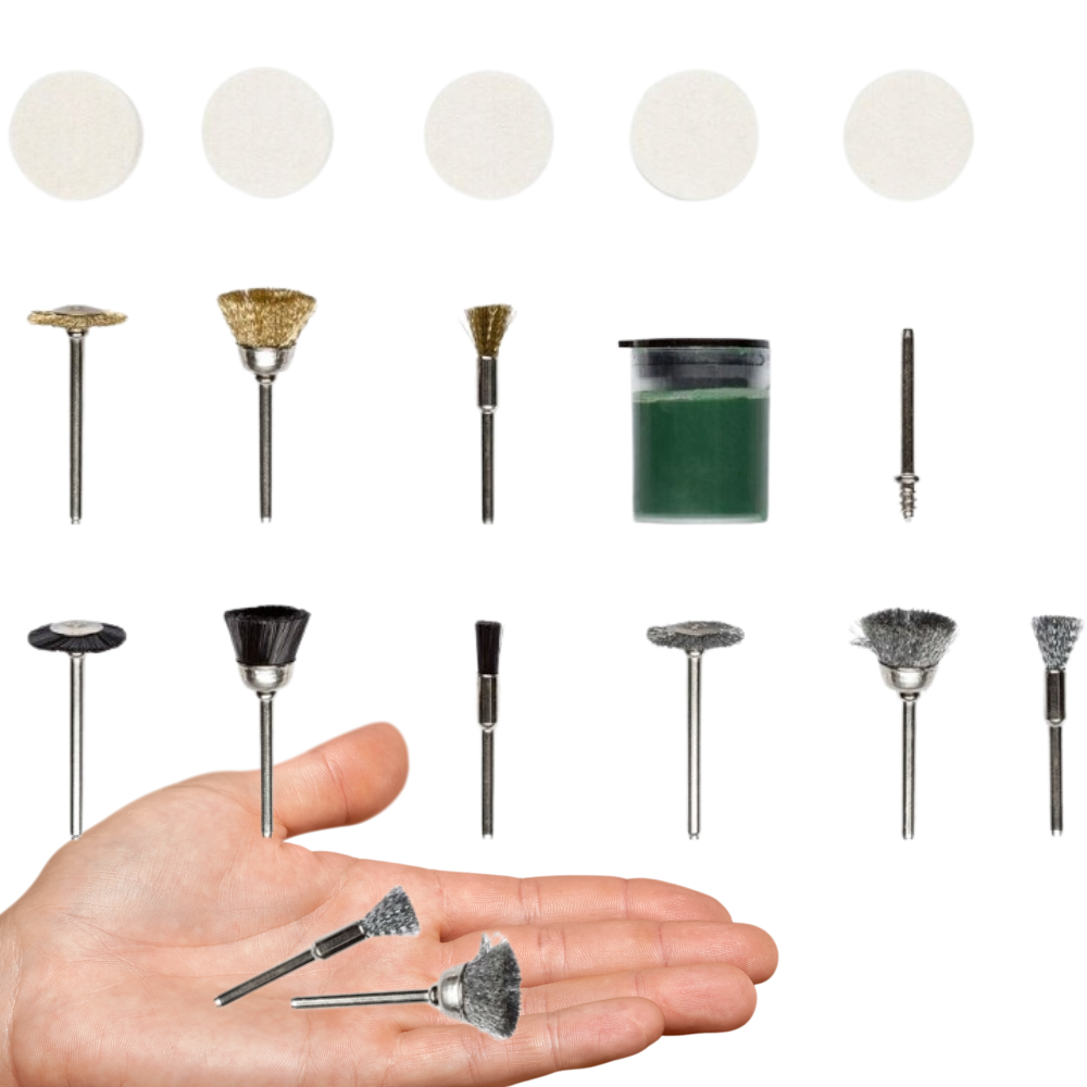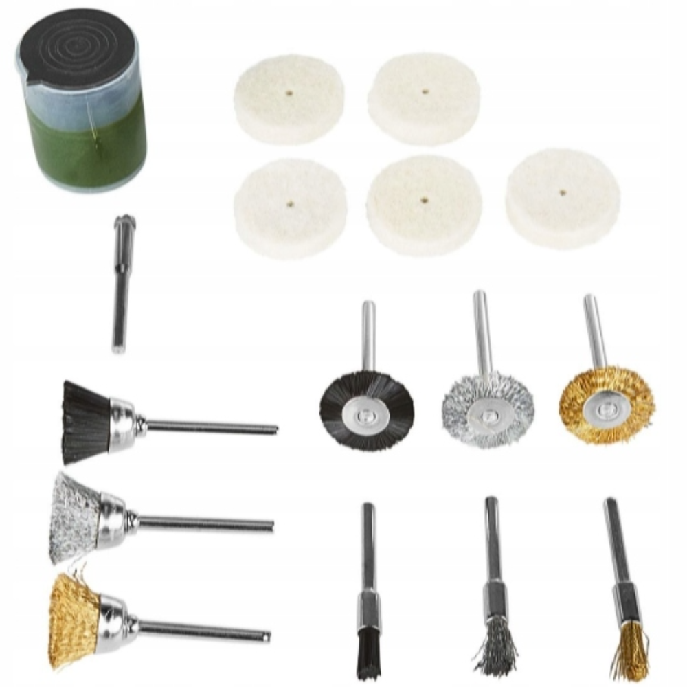 ✅ w zestawie szczotki do stali, mosiądzu i tworzyw sztucznych oraz tarcze filcowe i pasta szlifierska