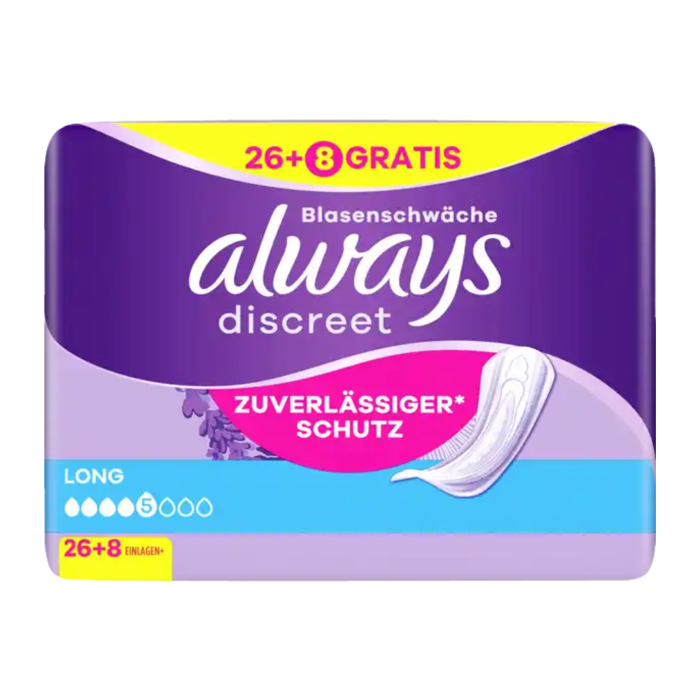 Wkładki chłonne Always Discreet Long zapewniają wszechstronną ochronę i dyskretne dopasowanie. Każda wkładka została zaprojektowana tak, aby zapewnić niezawodną ochronę przed przeciekaniem, neutralizację zapachu, natychmiastowe schnięcie oraz miękkość i delikatność w dotyku, jednocześnie dyskretnie dopasowując się do ciała. Gdy kichanie lub śmiech powodują nietrzymanie moczu, wkładki Always Discreet Long oferują niezawodną ochronę i dyskrecję, której pragniesz, dzięki czemu możesz czuć się pewnie.
