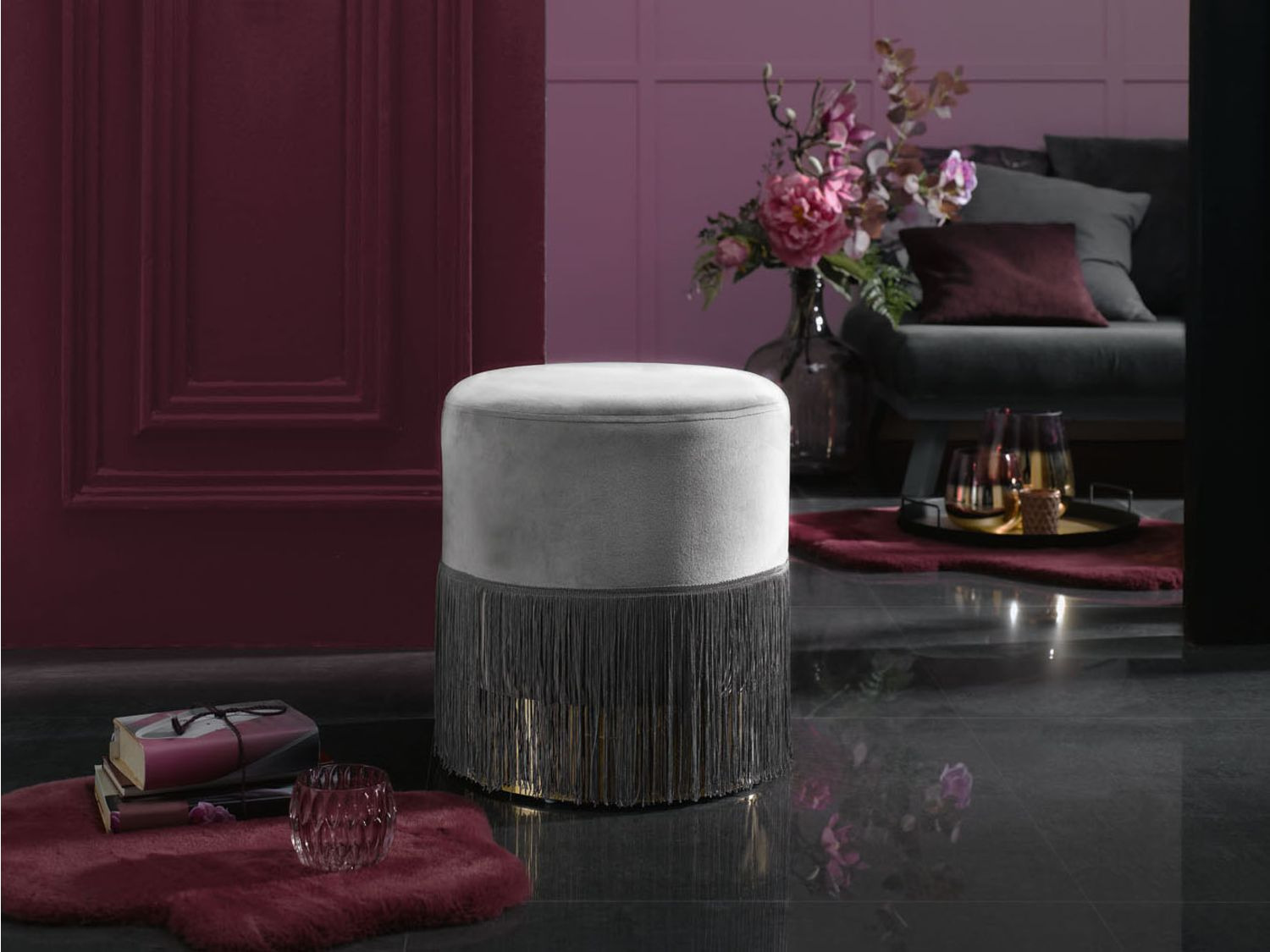 PUF Z AKSAMITNYM TAPICEROWANIEM Z FRĘDZLAMI LIVARNO HOME SZARY