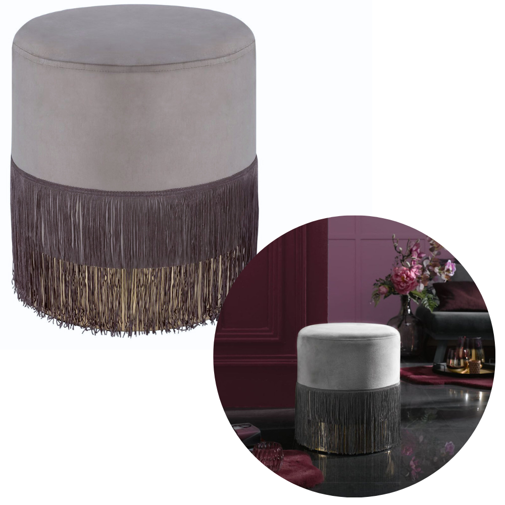 PUF TAPICEROWANY Z FRĘDZLAMI SZARA