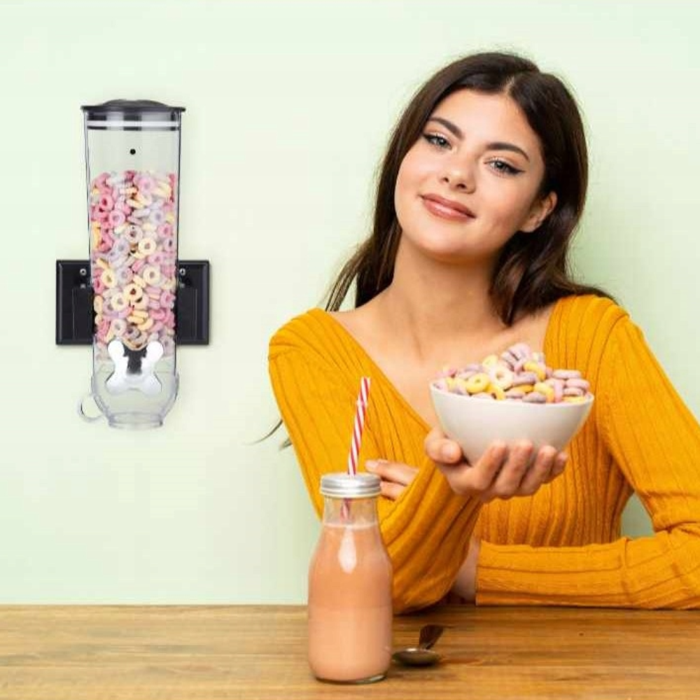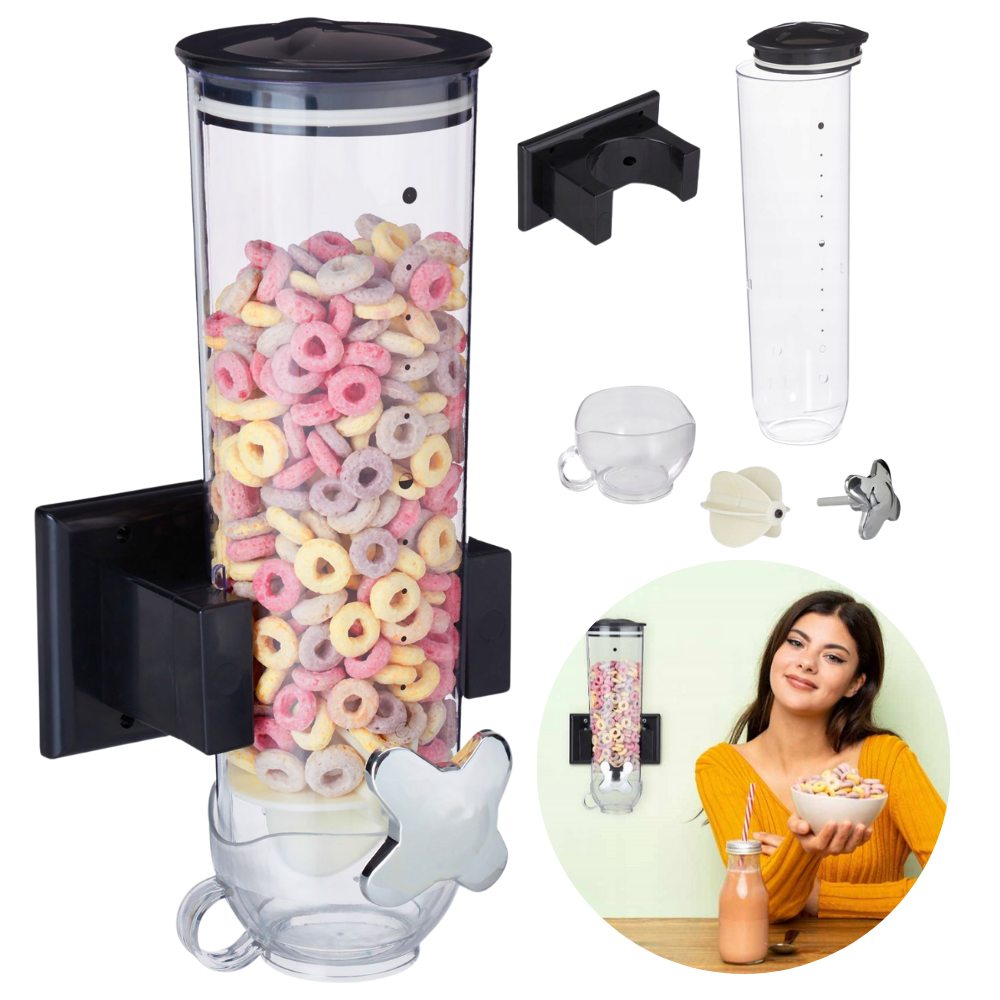 Najlepszą rzeczą na śniadanie jest miska pełna pysznych płatków kukurydzianych. Dozownik do płatków sprawia, że Twoje ulubione płatki są hermetycznie zamknięte i zawsze gotowe do użycia, tak aby można je było szybko i łatwo wsypać do miski. Dzięki kółku i dołączonej filiżance pobierasz zawartość dozownika płatków kukurydzianych w praktycznych porcjach. Dzięki możliwości montażu na ścianie dozownik do płatków nie zabiera miejsca na blacie kuchennym. Dozownik do żywności nadaje się również do ryżu, makaronu i innych produktów.