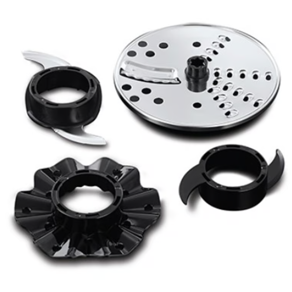 Akcesoria w komplecie: Tarcza do cięcia w plastry/szatkowania, przyrząd do wyrabiania ciasta, nóż ze stali nierdzewnej