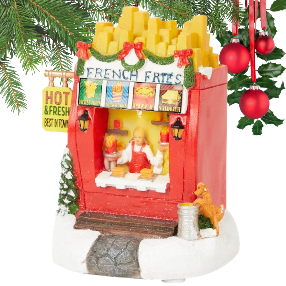 Wejdź do czarującego świata Magic Village French Fries z dekoracją świąteczną wioskową LED, gdzie smaczne frytki łączą się z magiczną świąteczną atmosferą, aby przeżyć niezapomniane wrażenia.