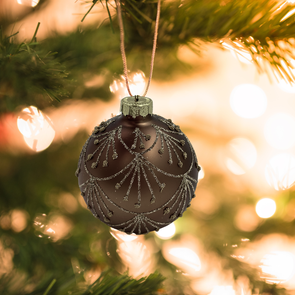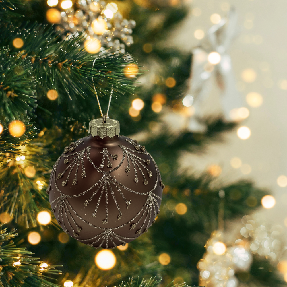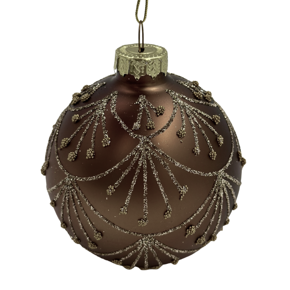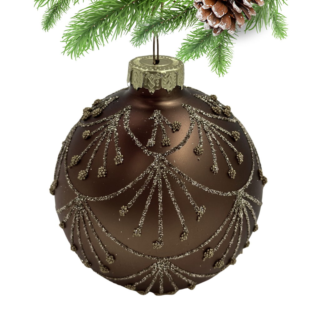 Ta szalenie elegancka bombka szklana z brązowym ,brokatowym dekorem, to dekoracja świąteczna, która świetnie się sprawdzi na Waszych choinkach !