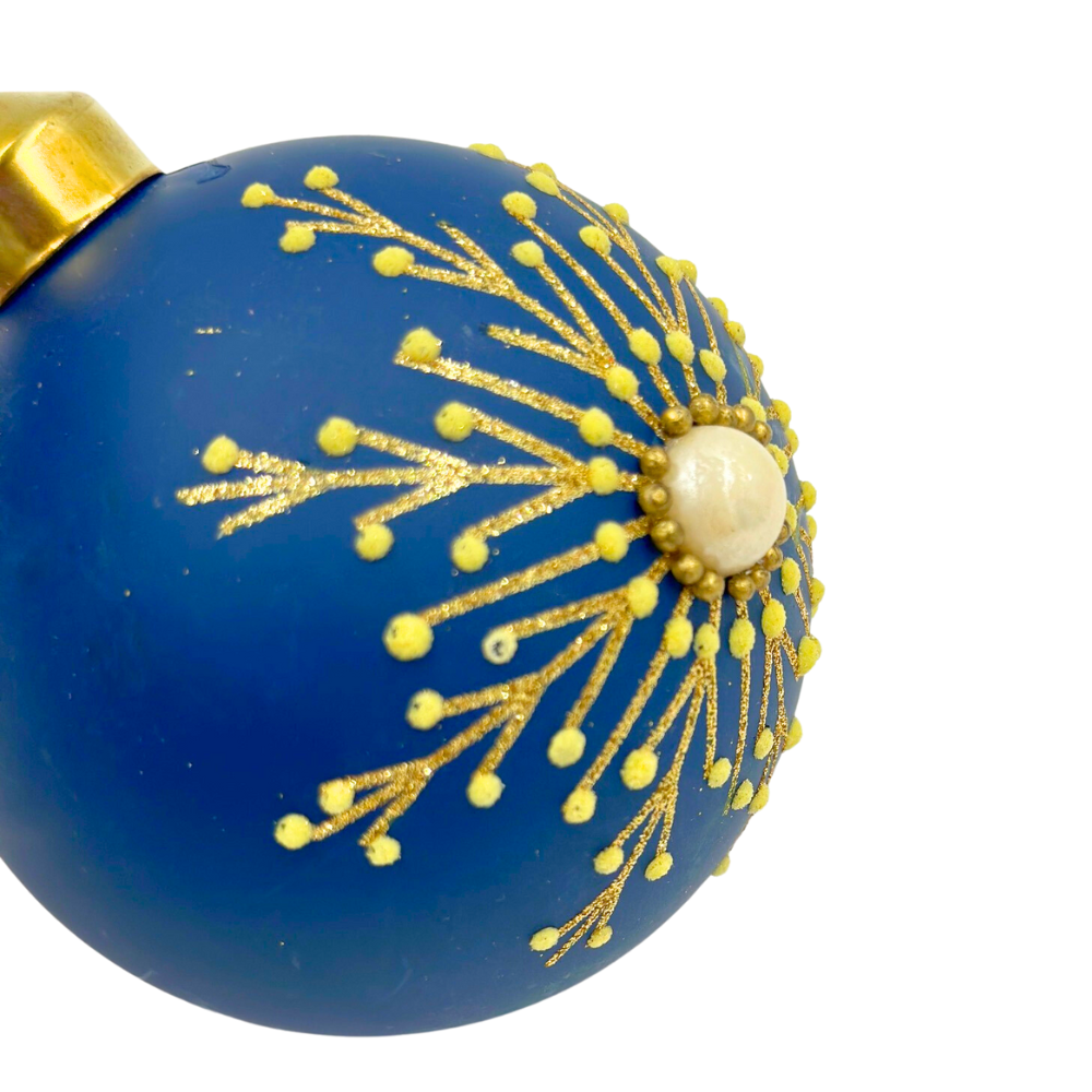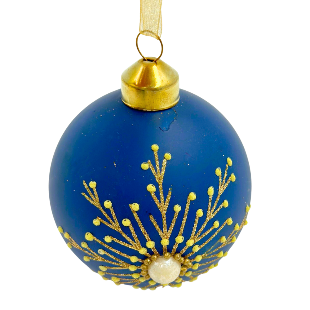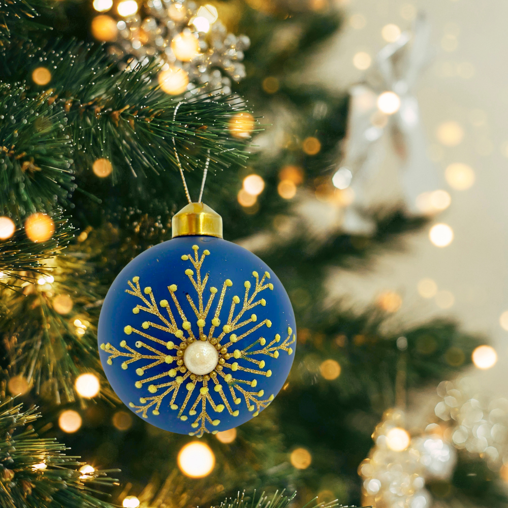 SZKLANA BOMBKA MATOWA NIEBIESKA ZŁOTA ŚNIEŻYNKA Z PEREŁKĄ