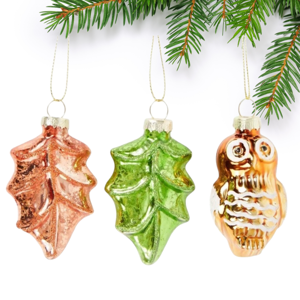 SZKLANE ZAWIESZKI ŚWIĄTECZNE 3SZT. SOWA LISTKI