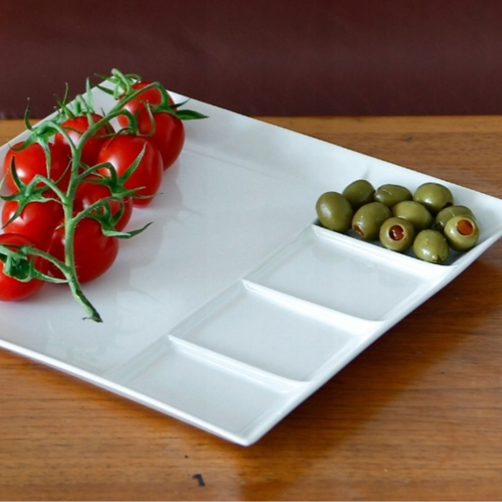 - Kwadratowy talerz z przegródkami oddzielającymi potrawy i sosy
