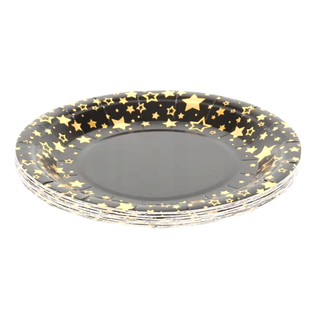 TALERZYKI JEDNORAZOWE CZARNE ZŁOTE GWIAZDKI 18CM