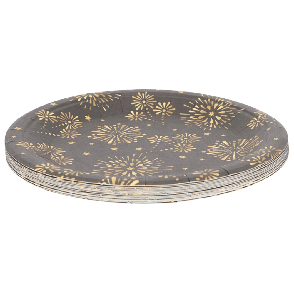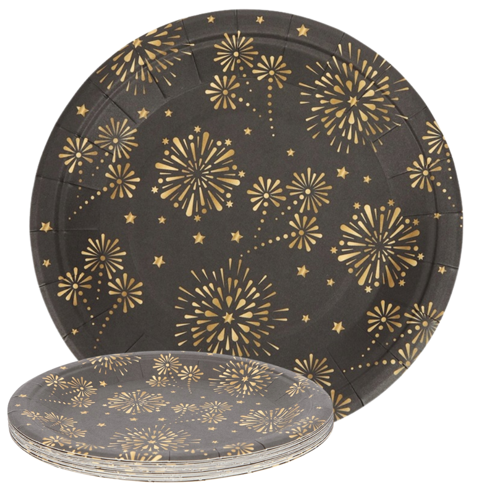 TALERZYKI PAPIEROWE 15SZT 18CM - CZARNE ZŁOTE FAJERWERKI DEKORACJA SEZONOWA