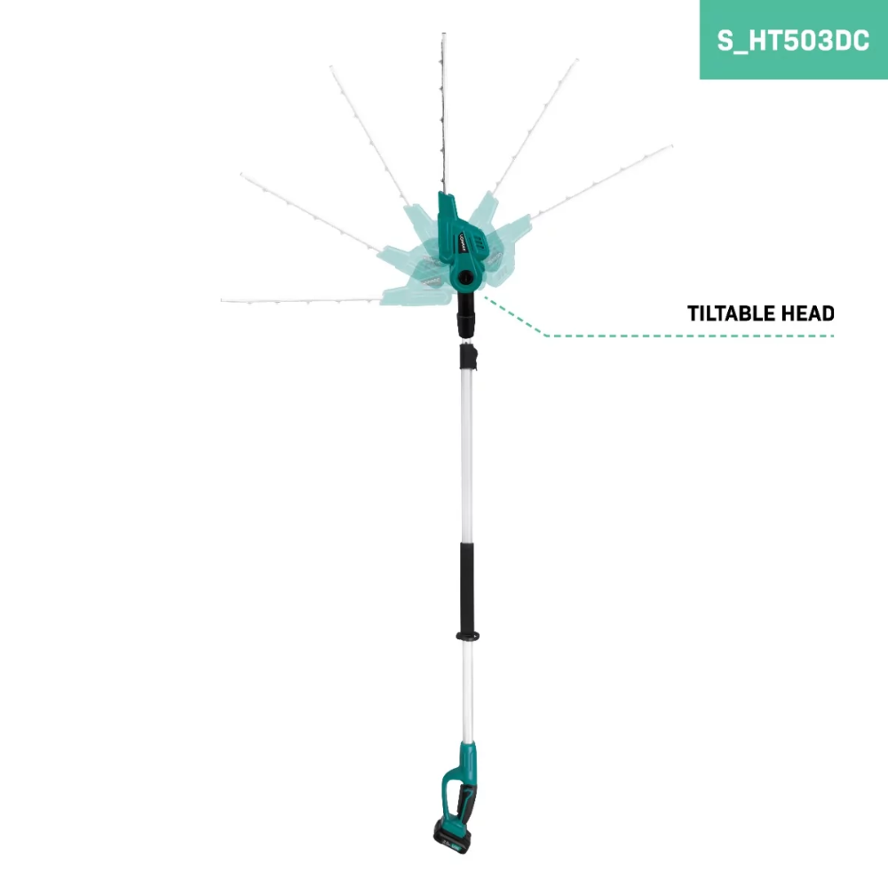Przechyl głowicę w dowolnej z sześciu pozycji, aby pracować pod odpowiednim kątem, w dowolnym momencie. Nawet na szczycie żywopłotu, gdzie długie ostrze (40 cm) z łatwością dotrze na całą szerokość.