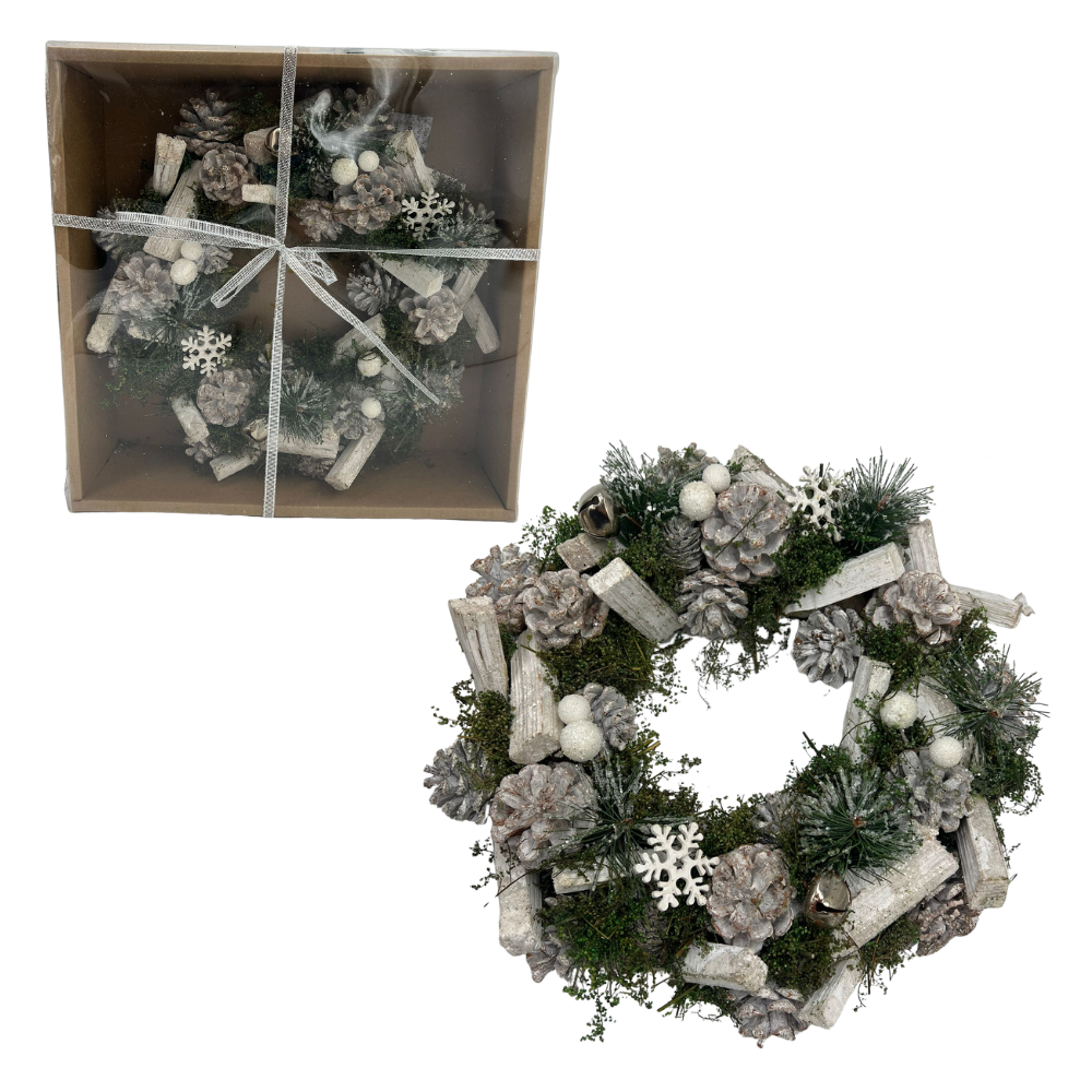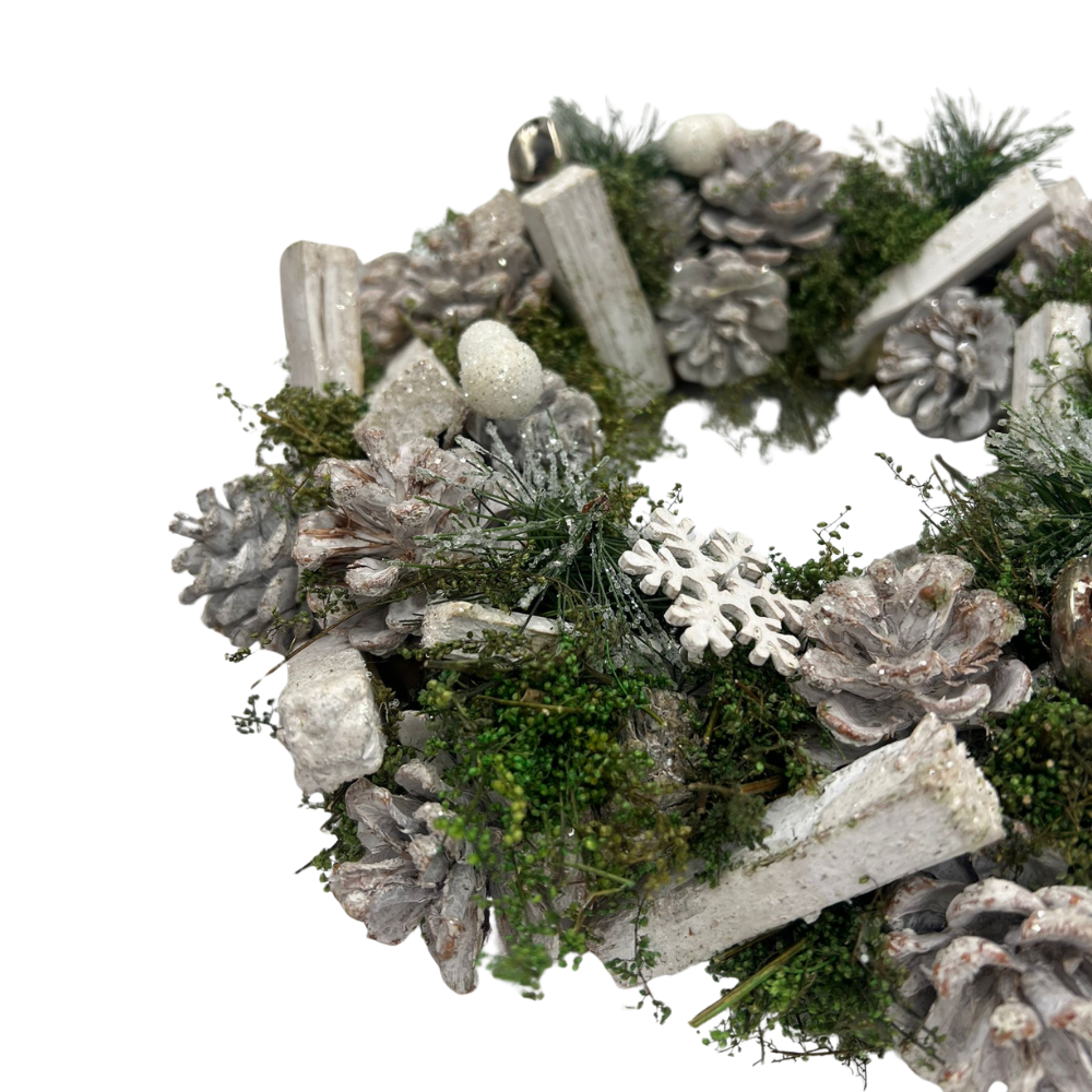 WIENIEC ŚWIĄTECZNY OZDOBA NA DRZWI BIAŁO-ZIELONY Z SZYSZKAMI 29CM
