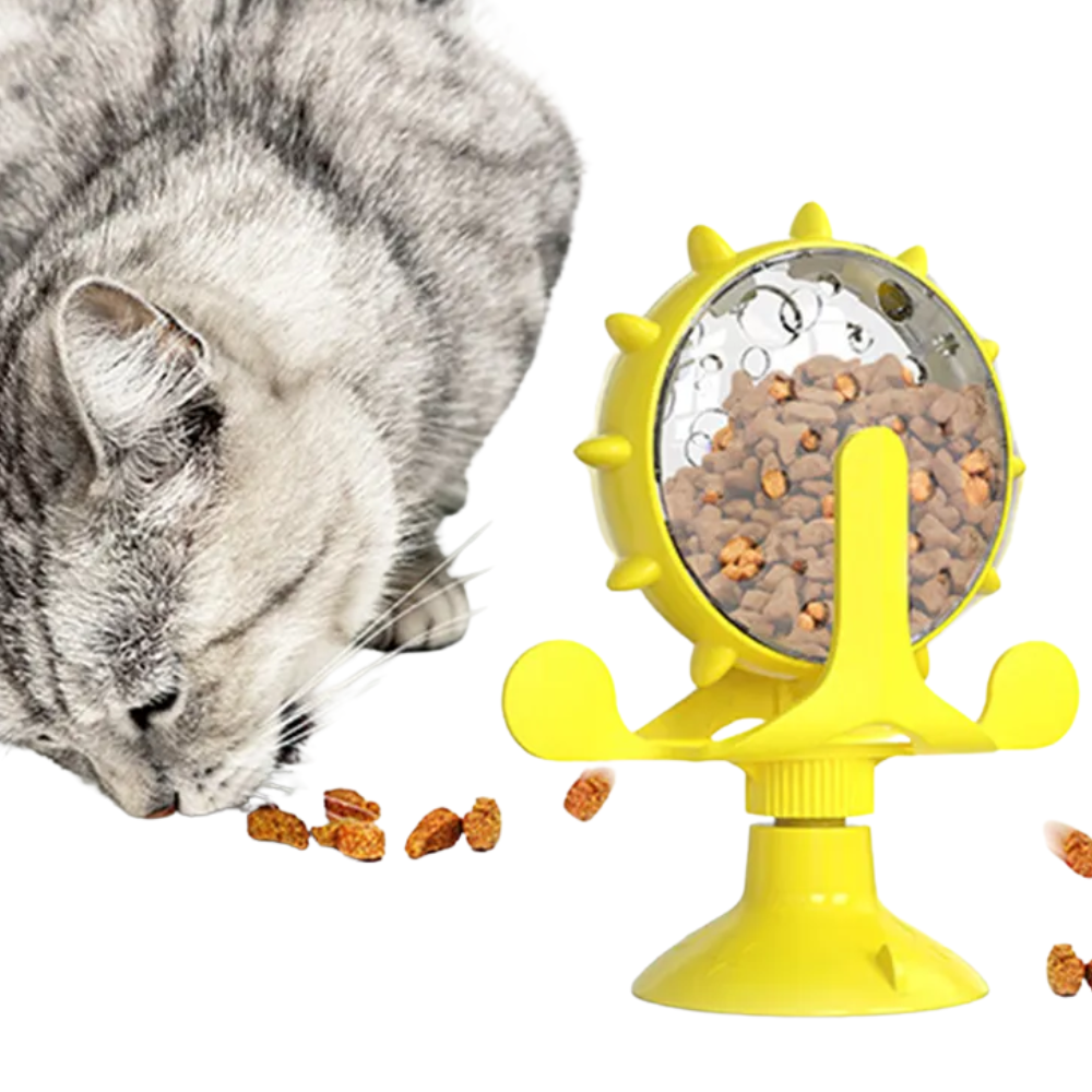 Interaktywna zabawka dla kota wyposażona w mocną przyssawkę, którą można zamocować na gładkiej powierzchni. Po dotknięciu łapką wiruje/obraca się, co natychmiast przyciąga uwagę i zachęca do zabawy. Transparentna kopuła zawiera elementy dzwoneczek, co dodatkowo stymuluje instynkt łowiecki i ciekawość kota.