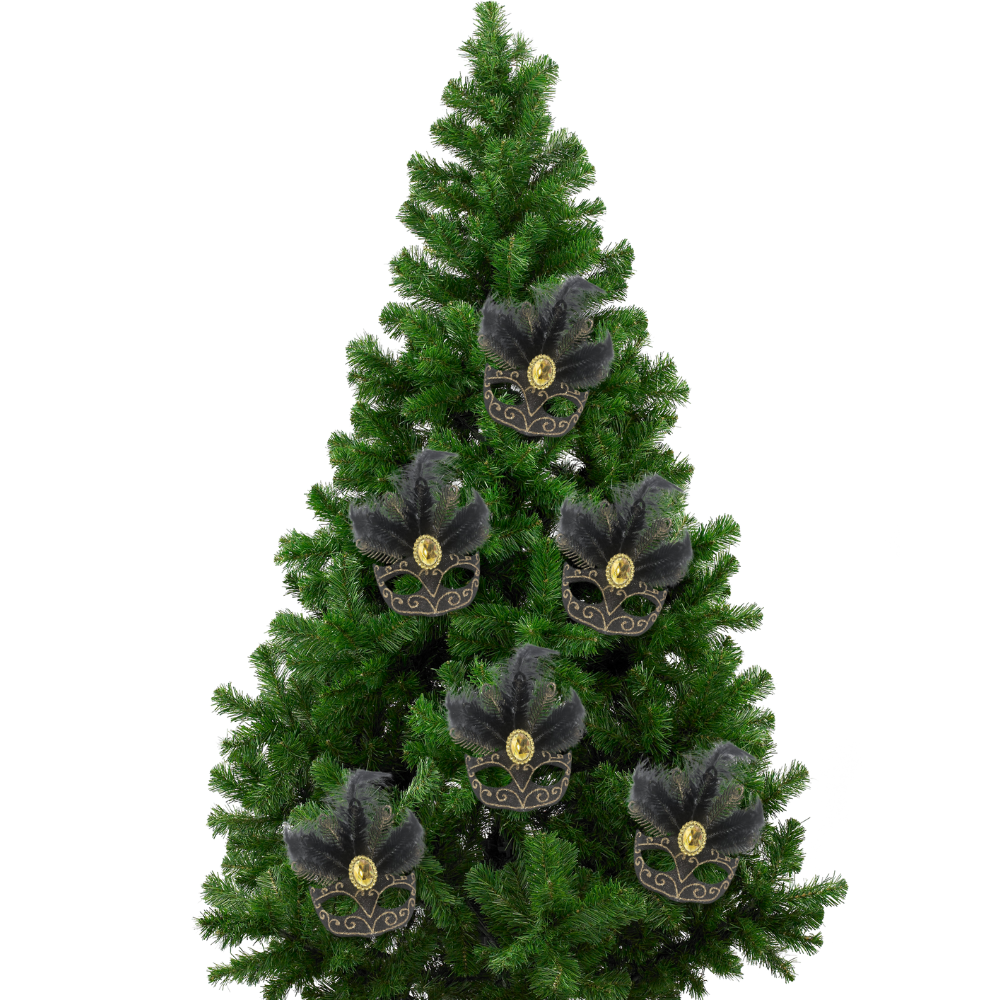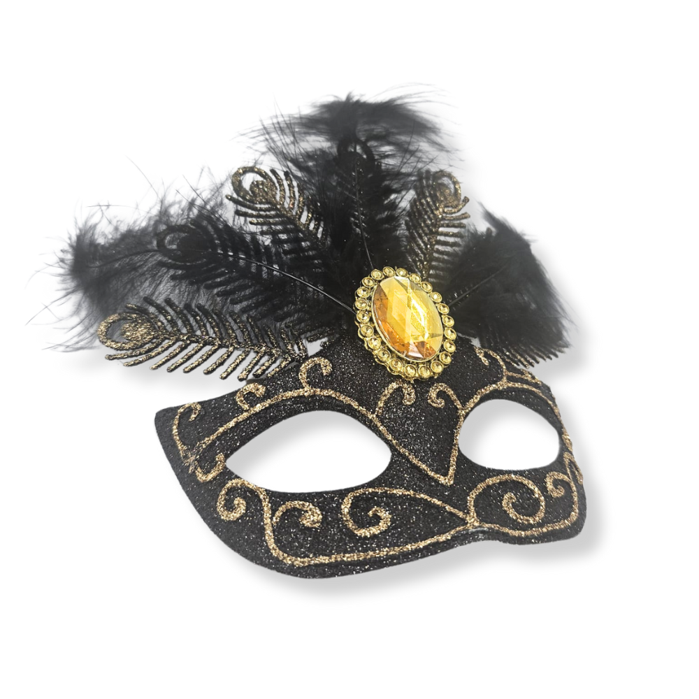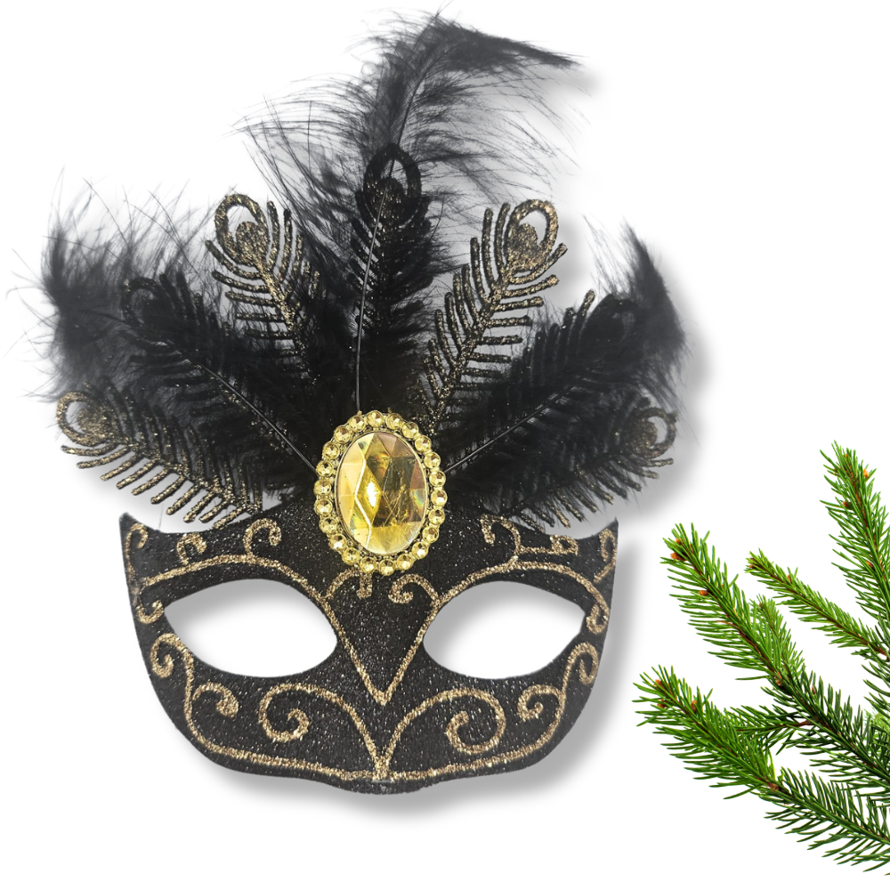 ZAWIESZKA DEKORACYJNA MASKA WENECKA CZARNA ZŁOTA BOMBKA CHOINKOWA PIÓRA