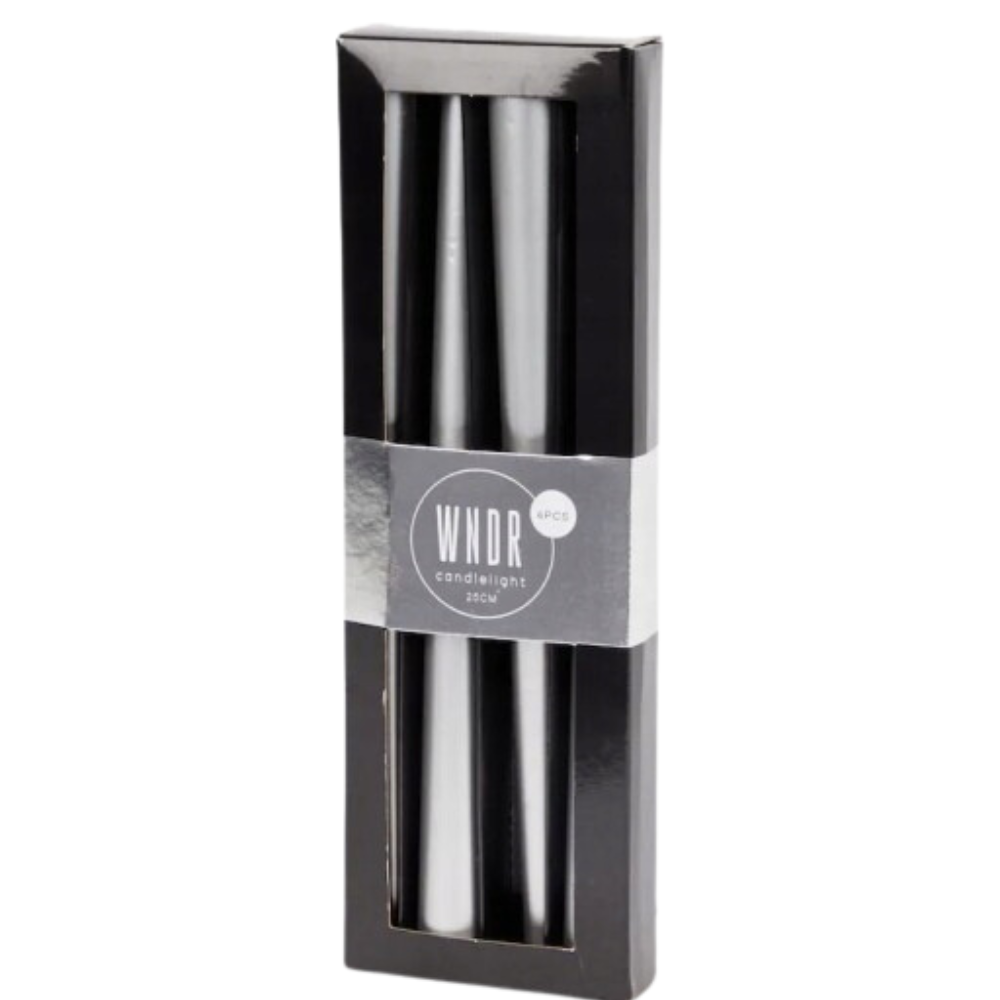 ZESTAW 4 DŁUGICH ŚWIEC ŚWIECZEK WNDR METALICZNE SREBRNE