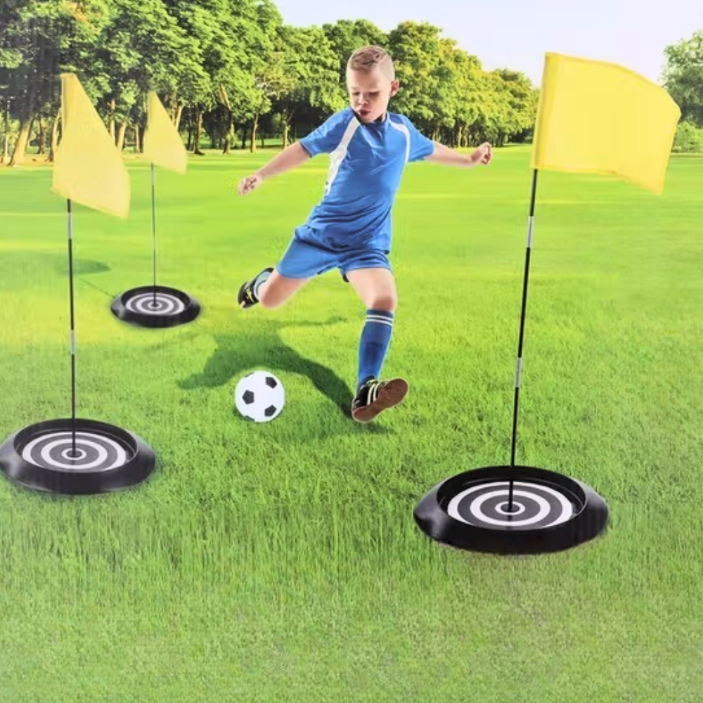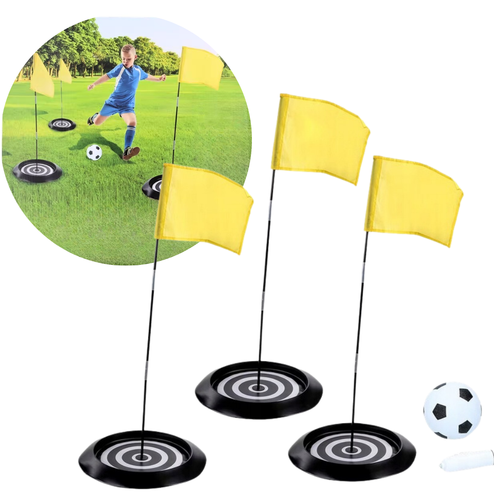- Kompletny zestaw z piłką, pompką i 3 flagami