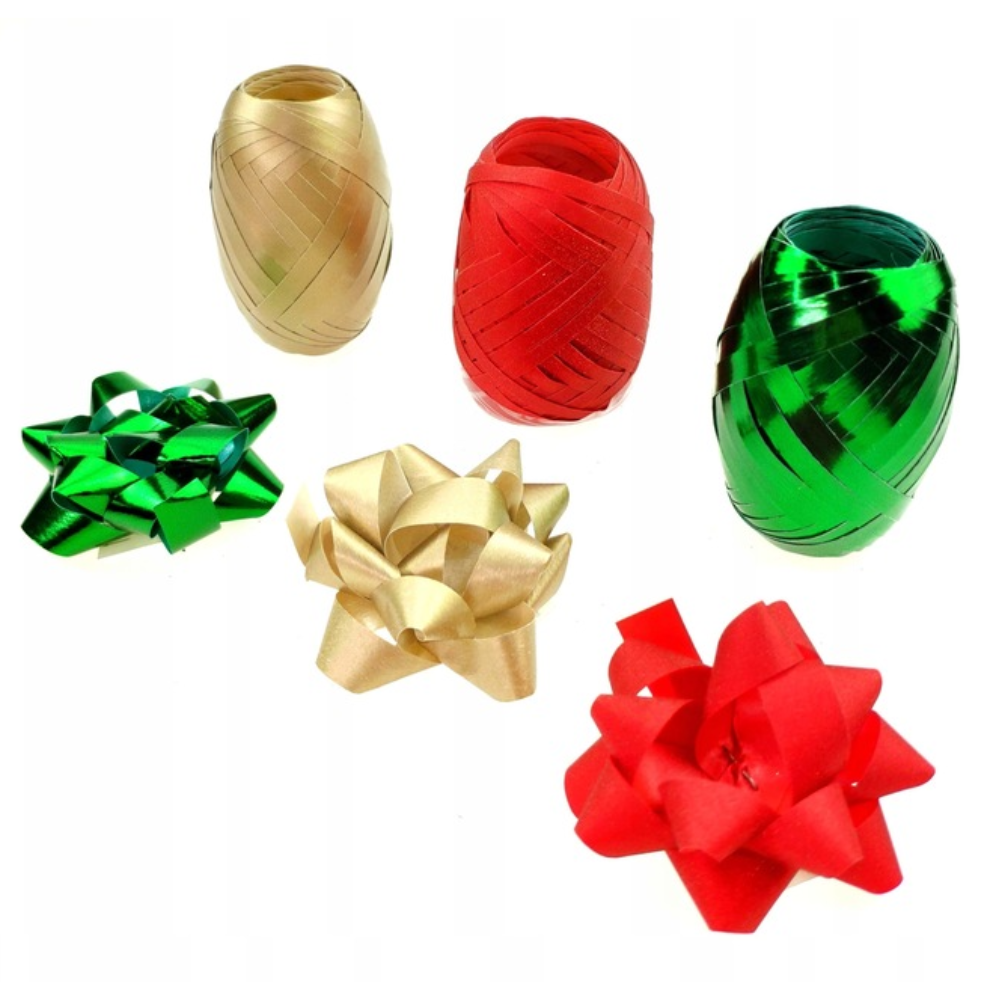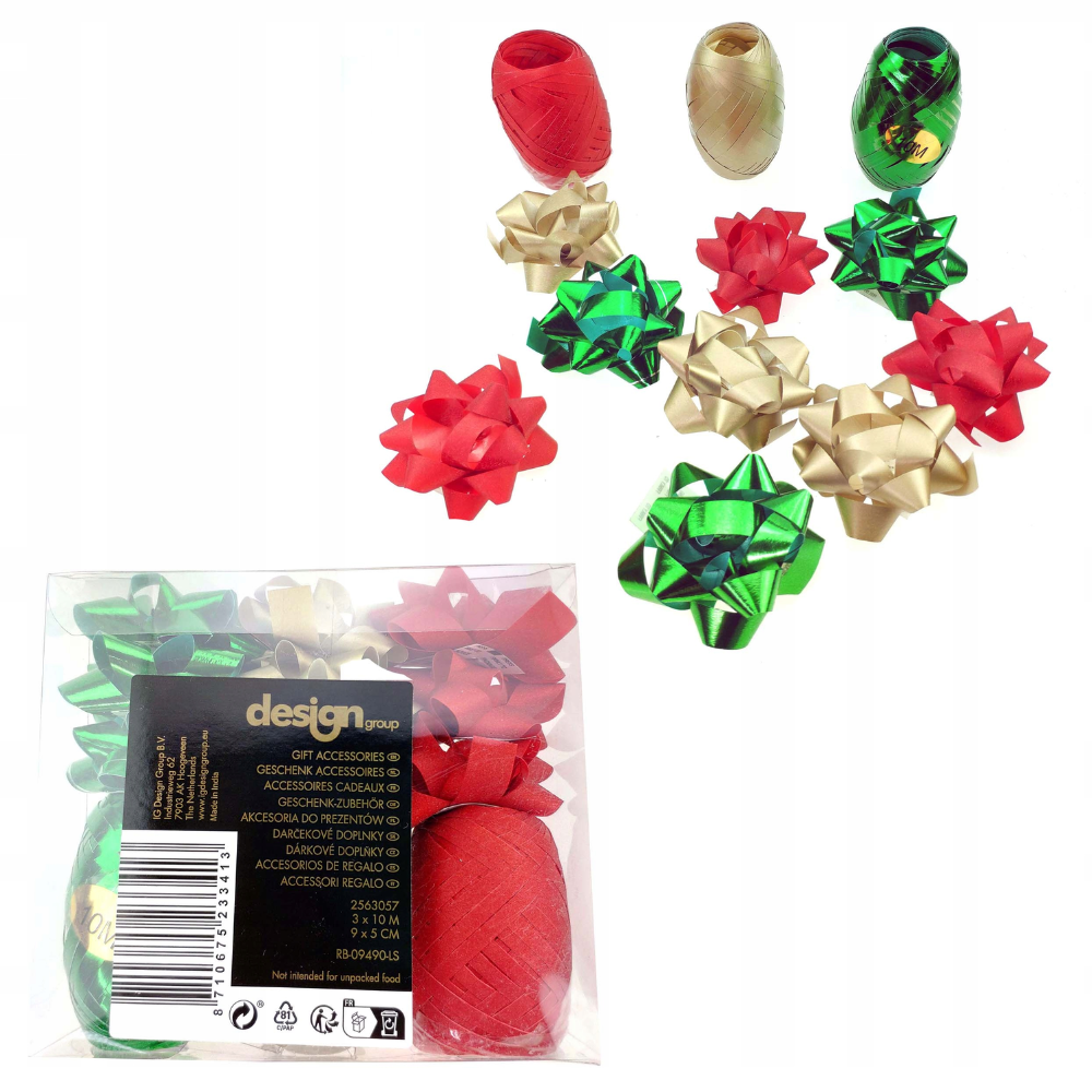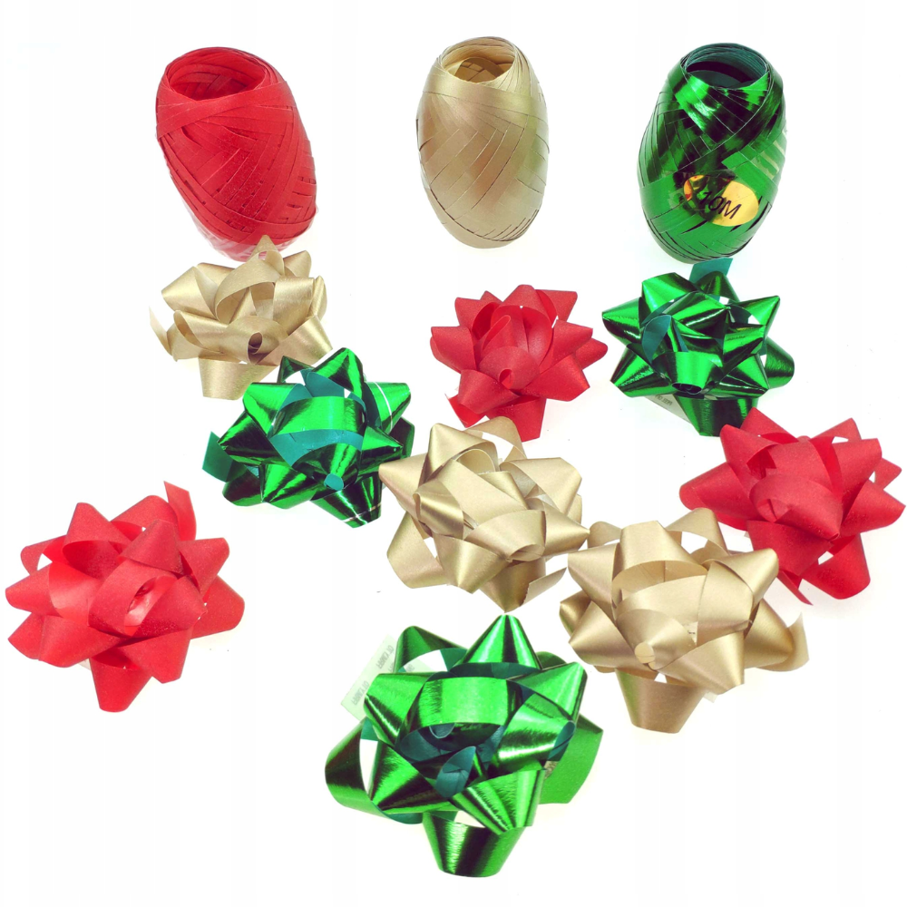 ZESTAW KOKARD I WSTĄŻEK PAKOWANIE PREZENTÓW DESIGN ZIELONY ZŁOTY CZERWONY