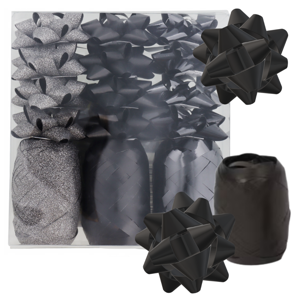 ZESTAW KOKARD I WSTĄŻEK DO PAKOWANIA PREZENTÓW DESIGN CZARNY SREBRNY GRAFIT